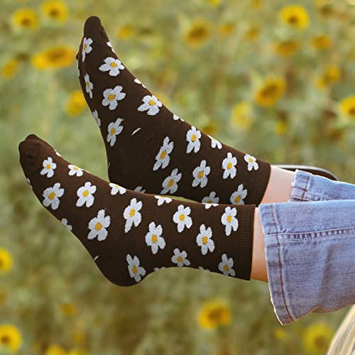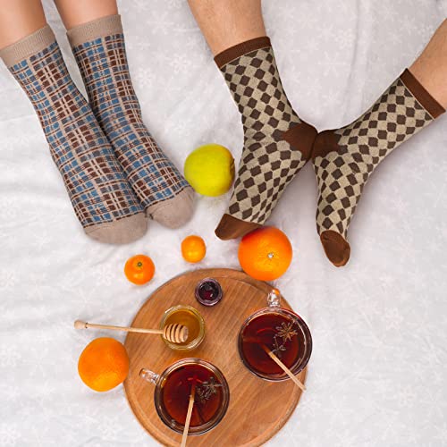 Geyoga 6 Pairs Vintage Cotton Socks for Women Floral Plaid Print Crew Brown Socks for Women
