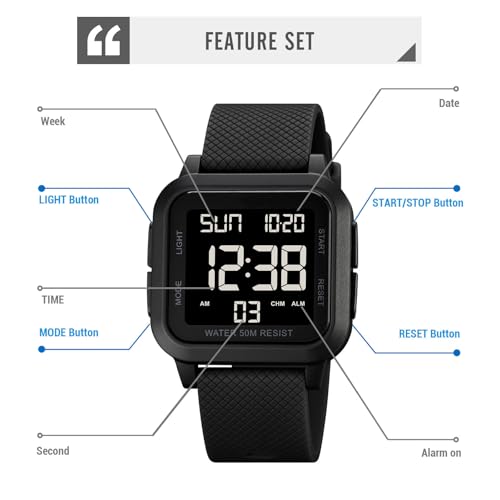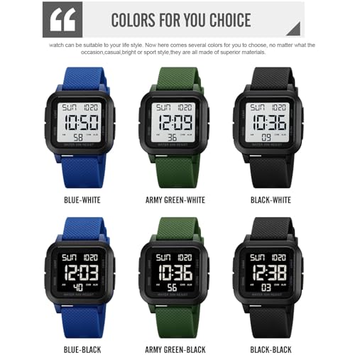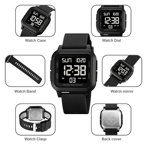 findtime Unisex Digital Watch Men Women Square Face Big Numbers LED Electronic Wrist Watches Waterproof/Alarm/Countdown Timer/Dual Time/Stopwatch/12/24H 4
