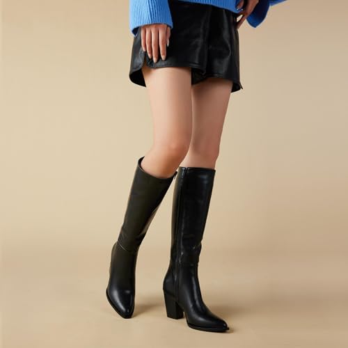 Putu Women's Knee High Boots Pointed Toe Tall Boots Stacked Chunky Heeled Boots with Zipper 4