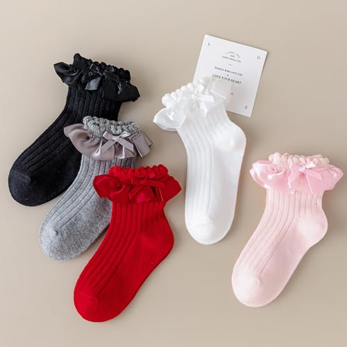 Meeshine 5 Pairs Baby Girls Socks Toddler Ruffle Lace Bow Frilly Dress Cotton Ankle Princess Socks for Kids 1-8T 4