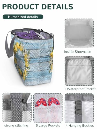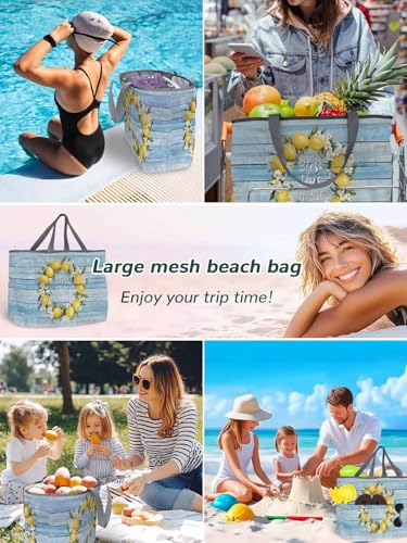 Beach Bags Women Mesh Tote Bag Farmhouse Lemon Flower Toy Grocery Pool Bag with Pockets for Travel/Picnic/Shower