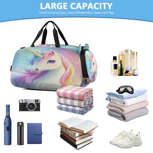 sizzling ! Sparkling Unicorn Colorful Kids Travel Duffel Bag for Boys Girls Overnight Weekend Tote Bag with Shoes Compartment for Trip Beach Gym