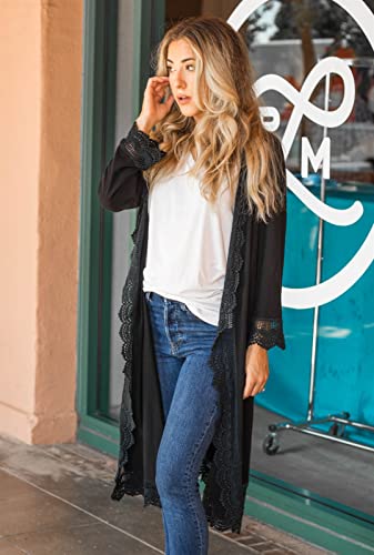 • Features- Looser fitting sleeves for a nice flow, longer length for extra coverage, sheer lace trim, silky lightweight material with a little bit of stretch and an open front style