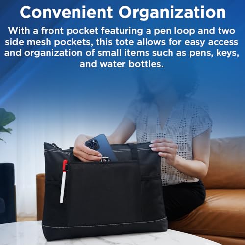 Why Choose Black Zippered Tote Bag with 600-D Polyester Fabric, 29.5-Inch Shoulder Straps, Zippered Compartment, Front Pocket with Pen Loop, and Side Mesh Pockets?