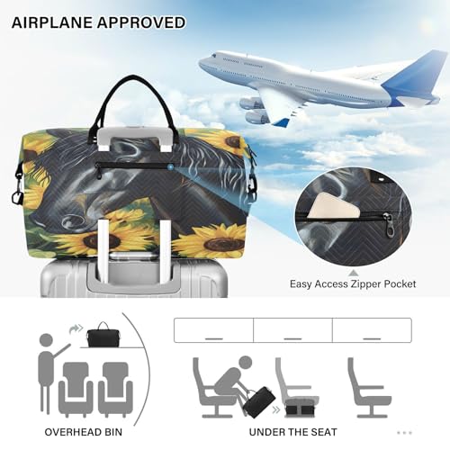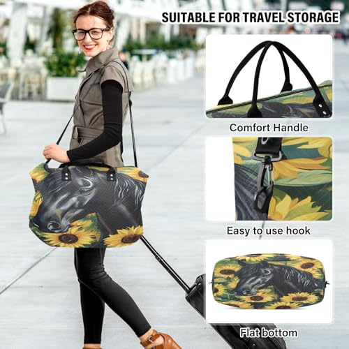 sizzling ! Horse Travel Gym Bag, Black Horse Sunflower Weekender Overnight Duffle for Women with Toiletry Bag Travel Swim