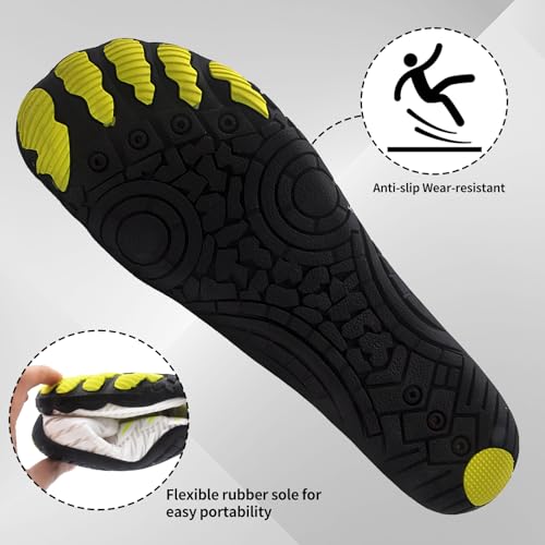 Sole material: RubberOuter material: MeshClosure type: Pull-OnWater resistance level: Water RepellentBreathable & snug Barefoot Shoes - Crafted with breathable synthetic fibers, these barefoot shoes keep your feet dry and cool. The well-ventilated sole ensures optimal comfort throughout the day.Anti-collision toe cap: The toe cap adopts a wrapped design, which effectively protects the toes and avoids injuries when climbing and walking, and has high safety.Secure Traction with Anti-Slip Design:Conquer any surface confidently with the strong rubber slip-resistant traction grip. The anti-slip design ensures stability, making these barefoot shoes reliable.Efficient Water Drainage System: Strategically placed drainage holes at the bottom of the shoes efficiently expel excess moisture, keeping your feet dry and comfortable, and preventing any sticky or uncomfortable sensations due to sweat or water exposure.Suitable for: Go wild in the water with these super comfortable and lightweight aquasport swim shoes, ideal for water sports or days exploring the beach, sea, rivers or lakes. Perfect for everyday use. premium materials and excellent craftsmanship ensure long-lasting durability.
