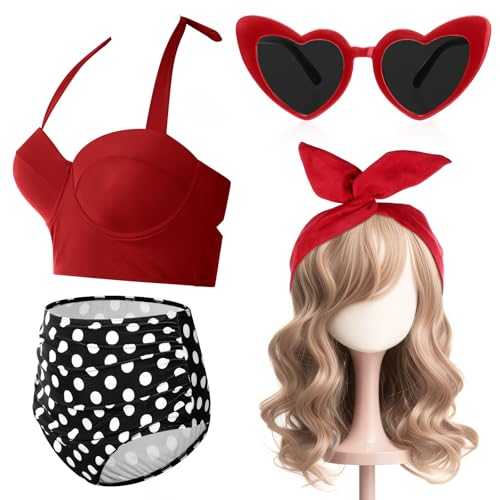 More information about JaGely 4 Pcs 1950s Women Retro Bikini Sets Vintage High Waisted Swimsuits Wire Headband and Heart Sunglasses