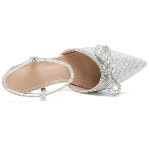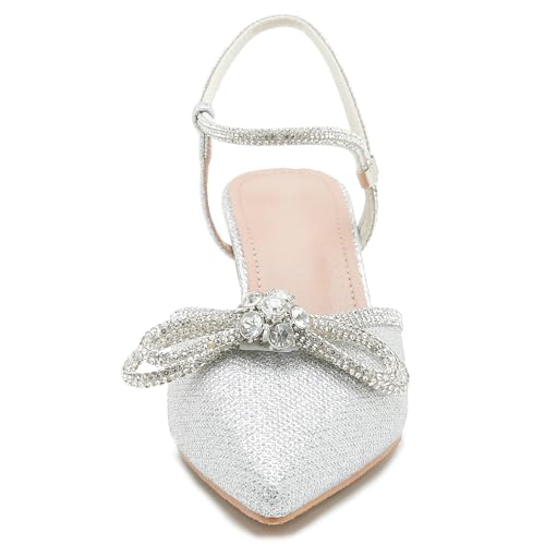 Women's Rhinstone Wedding Low Heel Slingback Kitten Heels, Adjustable Strap Pointed Toe Bow Pumps Prom Dress Shoes
