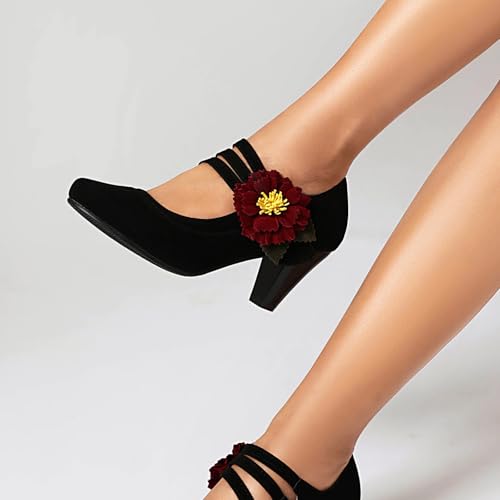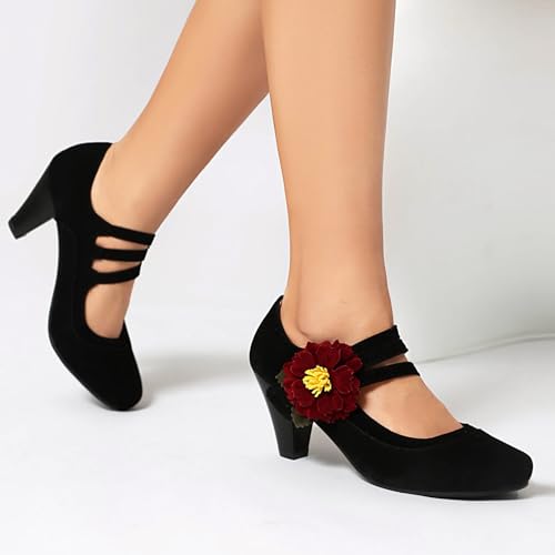 Elerhythm Women's Mary Jane Flower Ankle Strap Vintage Heels 1920s Pumps Closed Round Toe 1950s Victorian Retro Shoes 6