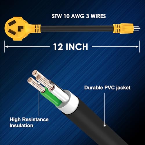 • Adapter Rating: Male: NEMA 5-15P, 15 Amp, 125V max rate 1875 watts. Female: NEMA 10-30R 30 Amps 3 prong 125V max rate 1875 watts, 1Ft STW construction with #10 AWG American wire gauge ETL Listed