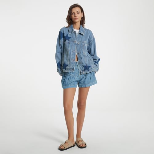 D-Sun Women Casual Denim Jacket Oversized Leopard Stars Printed Boyfriend Vintage Jean Jacket Coat with Pockets