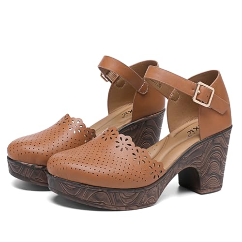 Altxic Women's Closed Round Toe Hollow Out Vamp Ankle Strap Buckle Low Block Chunky Heels Sandals 5