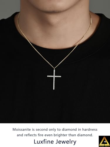 Material: Sterling SilverMetal type: Sterling SilverClasp type: LobsterChain type: CableGem type: Moissanite💎【Sparkling Moissanite】Luxfine moissanite cross necklace is meticulously polished, each gemstone is carefully selected. moissanite has a similar appearance to diamond and it will 100% pass diamond tester as diamond necklaces. 26 pieces round moissanite, total 0.8 carats, all moissanite are D color VVS1 clarity. Moissanite is second only to diamond in hardness and reflects fire even brighter than diamond. Add an extra sparkle to your look and it's perfect for everyday wear.💎【Material and Size】Luxfine cross necklace is made from 925 sterling silver and 14K gold plated, without any harmful materials. All of them are hypoallergenic and will never irritate your skin. Pendant Size: 0.98''*1.44'', Chain length: 17''+2.5'' extender, lobster clasp is easy to wearing.💎【Special Gift with Box】Gift a special necklace to someone special in your life. Beautifully packaged, this moissanite cross necklace comes with a gift box ready to gift. Moissanite necklaces are the best gift to show love or reward yourself for birthdays, anniversaries, Mother's Day, Christmas, Valentine's Day, Thanksgiving, weddings, and other holidays. This cross moissanite necklace has a classic design and is suitable for all ages and all occasions.💎【Cost-effective Jewelry】Luxfine jewelries are provided directly by our factory. So our price would be cheaper comparing with other moissanite products on Amazon. In addition, luxfine chooses moissanites prong-setting on the pendant, the quality of products would be under control and guaranteed.💎【Guarantee for You】30-day refund and 1-year warranty are guaranteed. The professional after-sales team would offer you the best service. Please feel free to contact us via Amazon if you have any problems. Perfect for everyday use. premium materials and excellent craftsmanship ensure long-lasting durability.