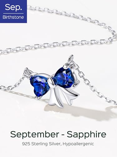 Material: Sterling SilverMetal type: Sterling SilverGem type: SapphireCharming Silver Bow Necklace:This elegant September birthstone necklaces, designed with a refined bow, adds sophistication to any outfit. The exquisite design complements Sapphire, symbolizing faith, wisdom, and loyalty. It’s believed to bring clarity and protection, perfect for those seeking deeper insights.Hypoallergenic Birthstone Necklace: Made from high-quality 925 sterling silver, this sapphire necklace for women is free from allergens and nickel, making it an excellent choice for those with sensitive skin. Its meaningful design and elegant finish provide both comfort and style, making it perfect for daily wear or special occasionsAdjustable & snug Fit: Pendant size is 0.51'' * 0.64'' (13mm * 16.3mm); Chain size: 16 inches + 2 inches extension/Resizable, ensuring the necklace fits perfectly. Clasp Type: Lobster-claw clasp, easy to put on. This dainty blue sapphire necklace offer a choice of 12 birthstones, designed for a comfortable and personalized wearIdeal Gift Choice: Birthstone means your family person birthday month, remember every important moment and lucky time. This sterling silver necklace for women makes the perfect gift for occasions like Mother’s Day, anniversaries, weddings, Christmas, Valentine’s Day, and more—ideal for mothers, grandmothers, wives, sisters, friends, lovers, couples, or a treat for yourselfDurable and Fade-Resistant: Crafted for long-lasting durability, this sapphire silver necklace is designed to maintain its brilliance and shine over time. Its timeless beauty ensures it remains a cherished addition to any collection. We offer excellent customer service and are happy to assist with any questions Perfect for everyday use. premium materials and excellent craftsmanship ensure long-lasting durability.