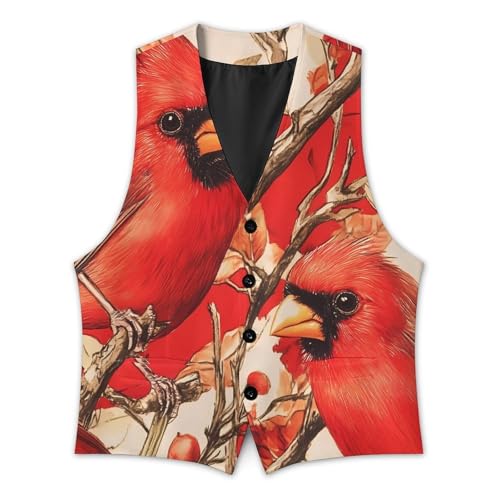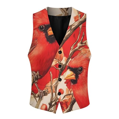 sizzling ! Cardinal Cute Bird Suit Vest for Men Waistcoat Dressy V Neck Button Down Sleeveless Business Jacket Coat
