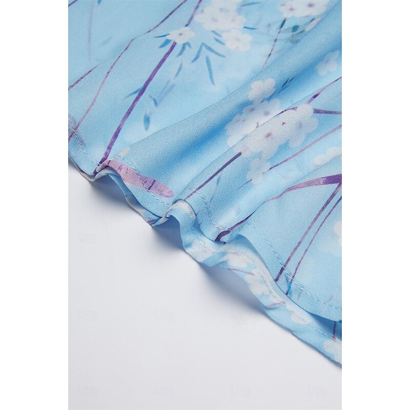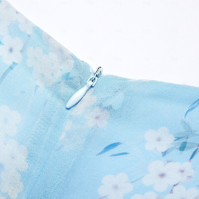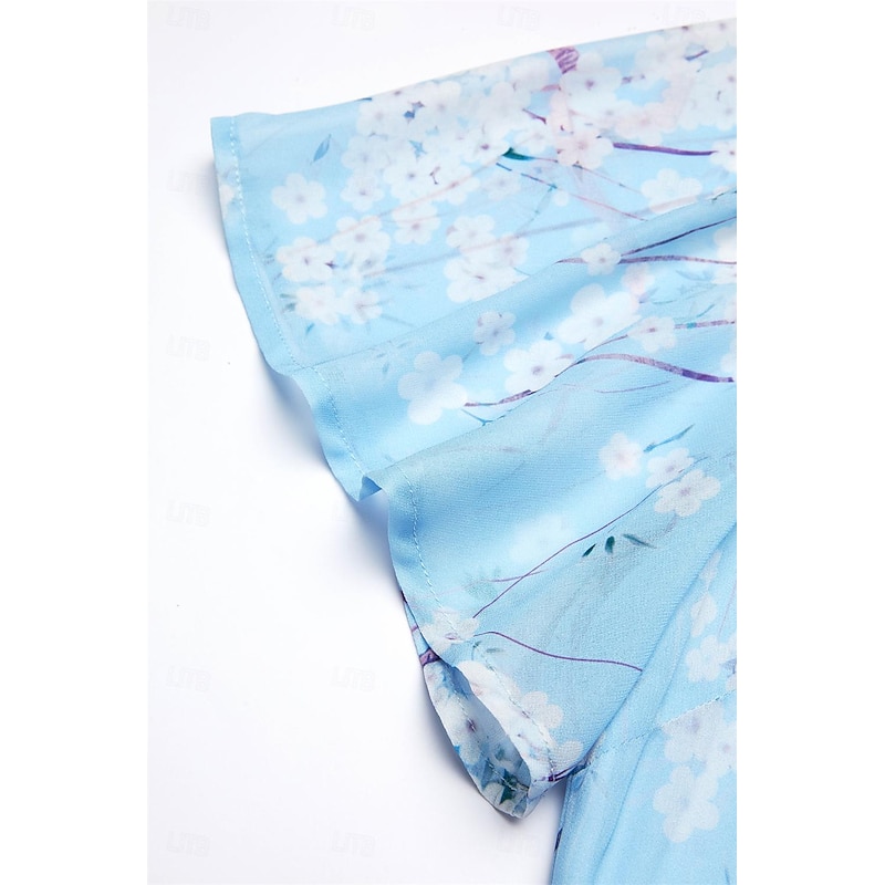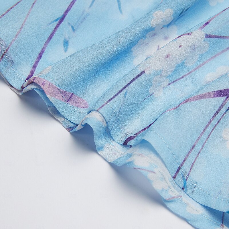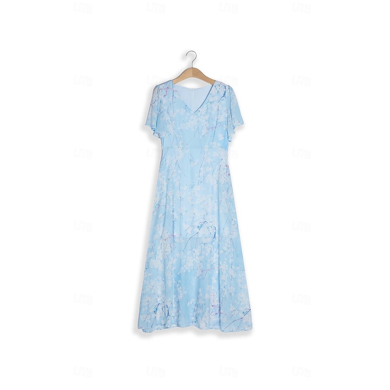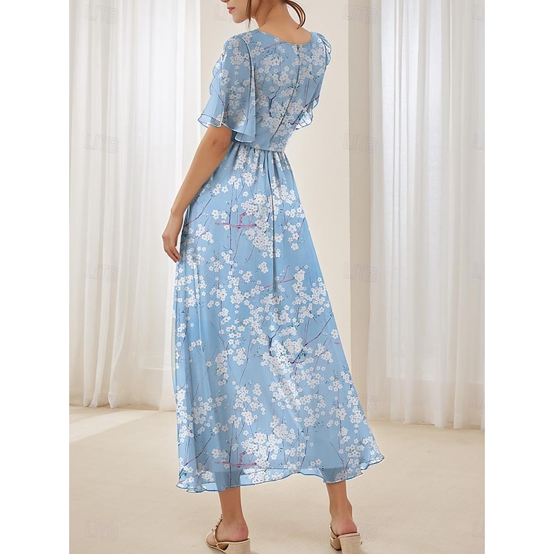 Highlights [Fabric] : Crafted from lightweight chiffon, this elegant dress offers breathability and a smooth, airy feel, perfect for warm summer days. The material's delicate texture contributes to its graceful drape and flow. [Silhouette] : The dress features a flattering A-line cut that beautifully follows the body's natural silhouette. Its maxi length enhances elegance, providing a sophisticated look suitable for various settings. [Design Highlights] : With a romantic V-neck and feminine short flutter sleeves, this dress stands out for its intricate floral pattern set against a serene blue background. The ruffle accents add a touch of whimsy, enhancing its overall charm. [Occasions] : Ideal for daily wear or special dates, this dress embodies elegance and comfort, making it perfect for summer outings, casual gatherings, or a romantic evening. [Size Range] : Available in sizes S, M, L, XL, and 2XL, ensuring a fit for a broad range of body types, allowing everyone to enjoy its elegant style.