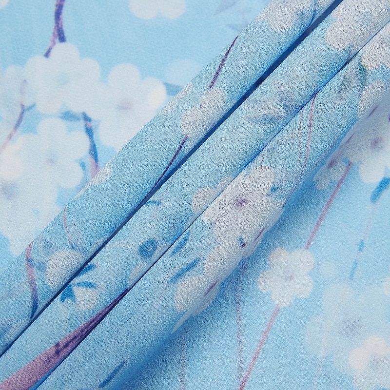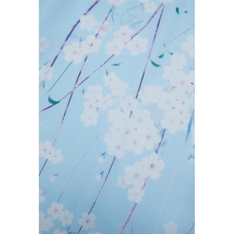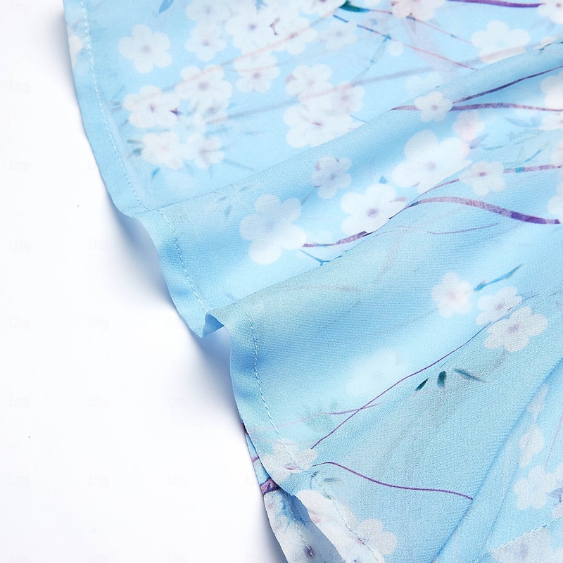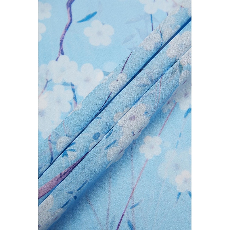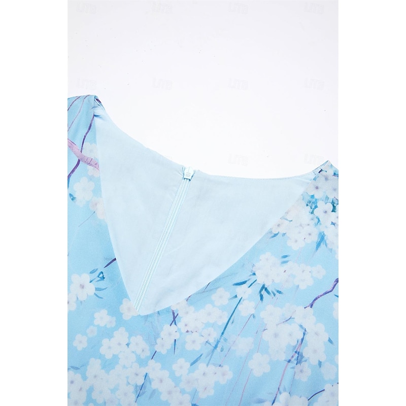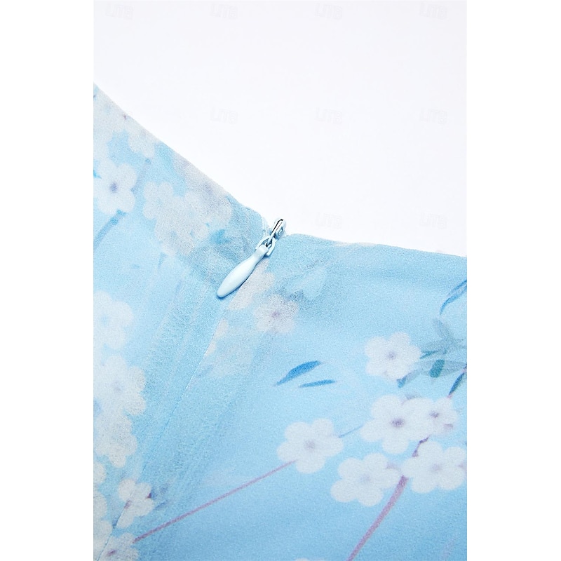 Highlights [Fabric] : Crafted from lightweight chiffon, this elegant dress offers breathability and a smooth, airy feel, perfect for warm summer days. The material's delicate texture contributes to its graceful drape and flow. [Silhouette] : The dress features a flattering A-line cut that beautifully follows the body's natural silhouette. Its maxi length enhances elegance, providing a sophisticated look suitable for various settings. [Design Highlights] : With a romantic V-neck and feminine short flutter sleeves, this dress stands out for its intricate floral pattern set against a serene blue background. The ruffle accents add a touch of whimsy, enhancing its overall charm. [Occasions] : Ideal for daily wear or special dates, this dress embodies elegance and comfort, making it perfect for summer outings, casual gatherings, or a romantic evening. [Size Range] : Available in sizes S, M, L, XL, and 2XL, ensuring a fit for a broad range of body types, allowing everyone to enjoy its elegant style.
