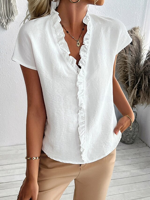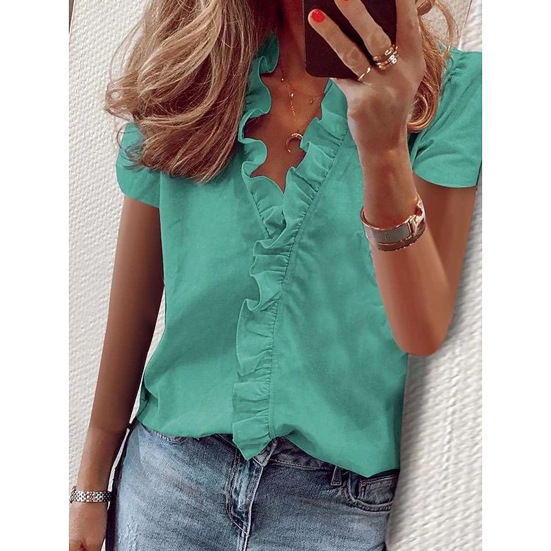 sizzling ! Women's Shirt Solid Color Plain Elegant Tropical Daily Short Sleeve V Neck Regular Tops Daily Holiday Beach Wear Ruffle White Orange Green Light Blue Summer Spring