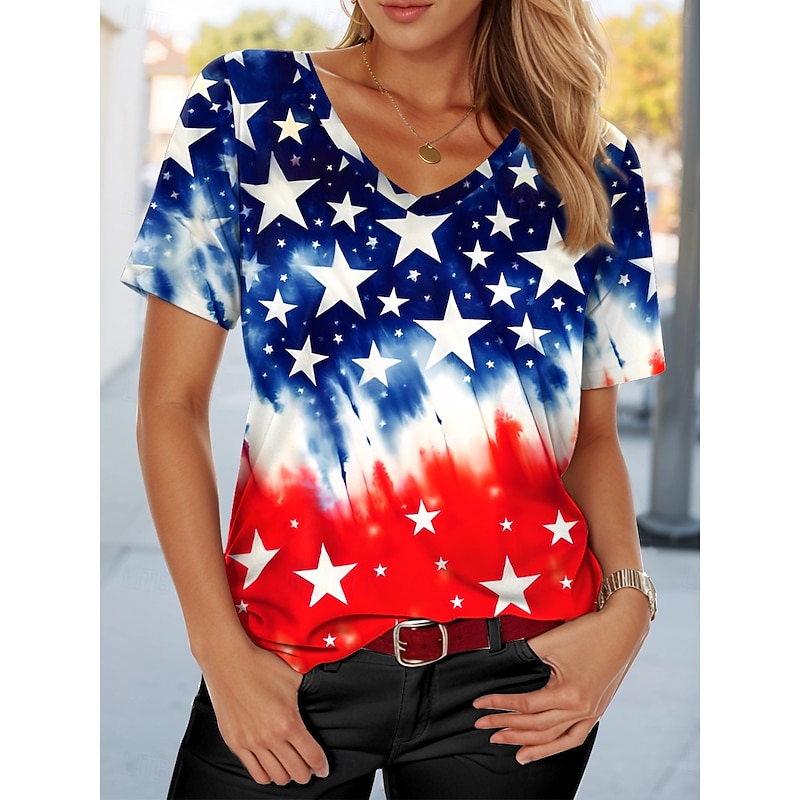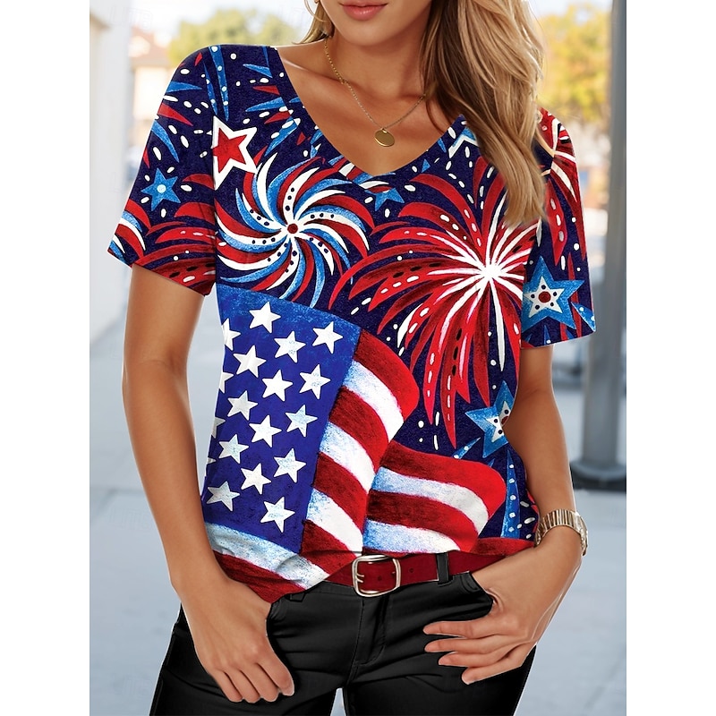 Highlights [Fabric] : Crafted from a lightweight and breathable polyester blend, this women's t-shirt offers a comfortable and durable wear experience. The micro-elastic fabric provides ease of movement, making it perfect for daily activities and summer outings. [Fit] : Designed with a relaxed fit, this t-shirt ensures maximum comfort and versatility. The regular top length and short sleeves make it an ideal choice for casual wear, providing a laid-back yet modern appearance. [Design Features] : Inspired by the American flag, the t-shirt showcases a dynamic blend of red, white, and blue colors, accented with white stars for a patriotic look. The V-neckline adds a touch of femininity, enhancing its overall appeal as a stylish wardrobe staple. [Occasions] : Perfect for Independence Day celebrations, casual summer outings, or daily wear. This versatile t-shirt is suitable for a range of occasions where you want to express your patriotic spirit or simply enjoy a comfortable, casual style. [Size Range] : Available in sizes S, M, L, XL, and 2XL, this t-shirt caters to a broad range of body types, ensuring a suitable fit for everyone looking to add a touch of patriotism to their summer wardrobe. Perfect for everyday use. first-class materials and excellent craftsmanship ensure long-lasting durability.