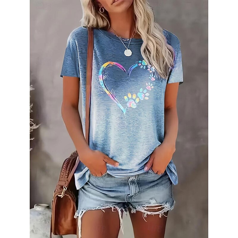 Highlights [Fabric] : Made from a high-quality polyester blend, this T-shirt offers a soft, breathable feel, making it perfect for warm summer days. The fabric features a slightly heathered texture that provides a modern, modern appearance. [Fit & Style] : With its loose fit and micro-elasticity, this T-shirt ensures comfortable wear throughout the day. The short sleeves and classic crew neck design make it an ideal choice for casual, laid-back occasions. [Design Highlights] : The standout feature of this T-shirt is its eye-catching print design. It showcases a vibrant heart graphic adorned with an artistic pattern of flower petals and paws, adding a playful and colorful touch to your daily ensemble. [Occasions] : Perfect for everyday wear, this T-shirt is versatile enough for casual outings, relaxing weekends, or running errands. Pair it effortlessly with denim shorts or jeans for a chic and easygoing summer style. [Size Range] : This T-shirt is available in a variety of sizes, including S, M, L, XL, and 2XL, ensuring a comfortable fit for different body types. Choose from a range of charming colors such as Blue, Green, Red, and Gray to suit your personal style. Perfect for everyday use. first-class materials and excellent craftsmanship ensure long-lasting durability.