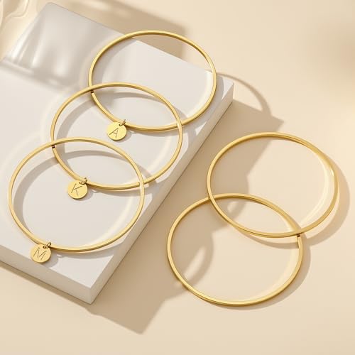 Initial Gold Bracelets for Women 18K Gold Plated A-Z Initial Bangle Bracelets for Women Set Stackable Thin Round Bangle Bracelet Dainty Non Tarnish Dainty Cute Initial Stainless Steel Bracelet Teen Trendy Gifts Jewelry