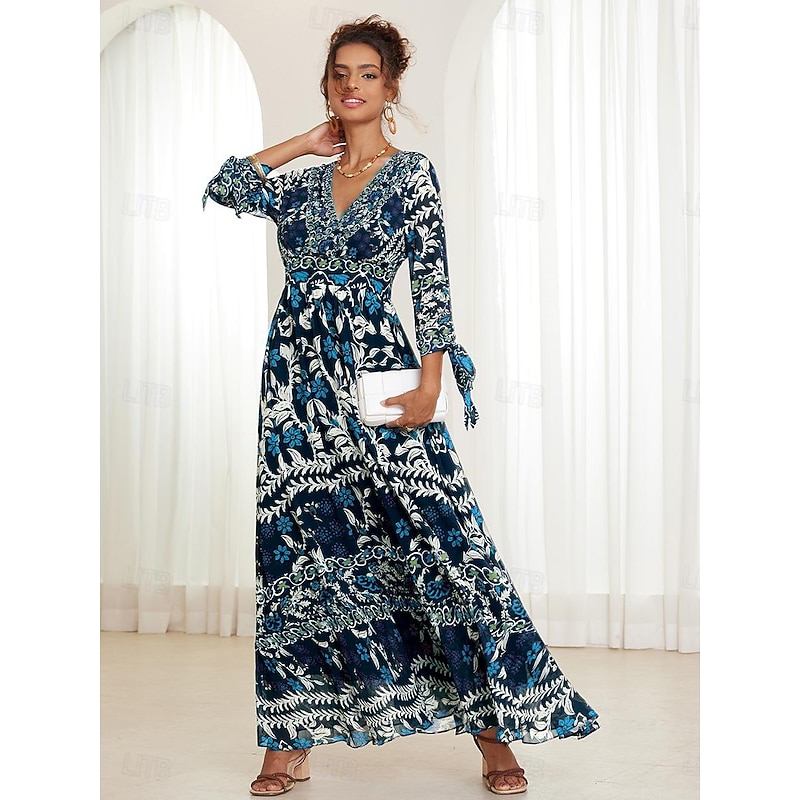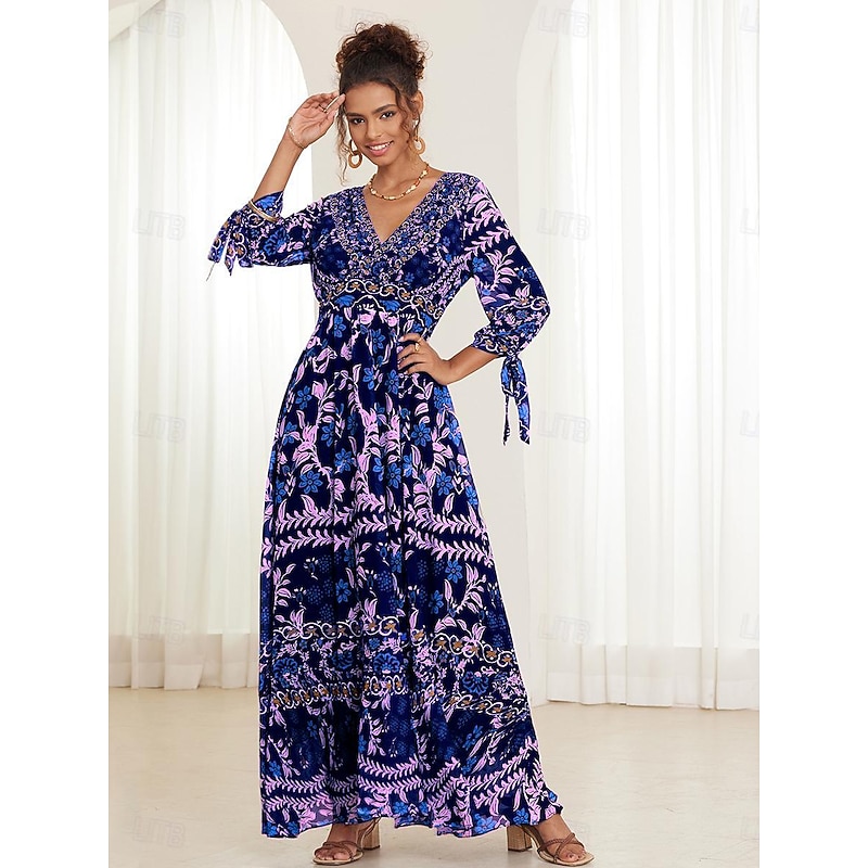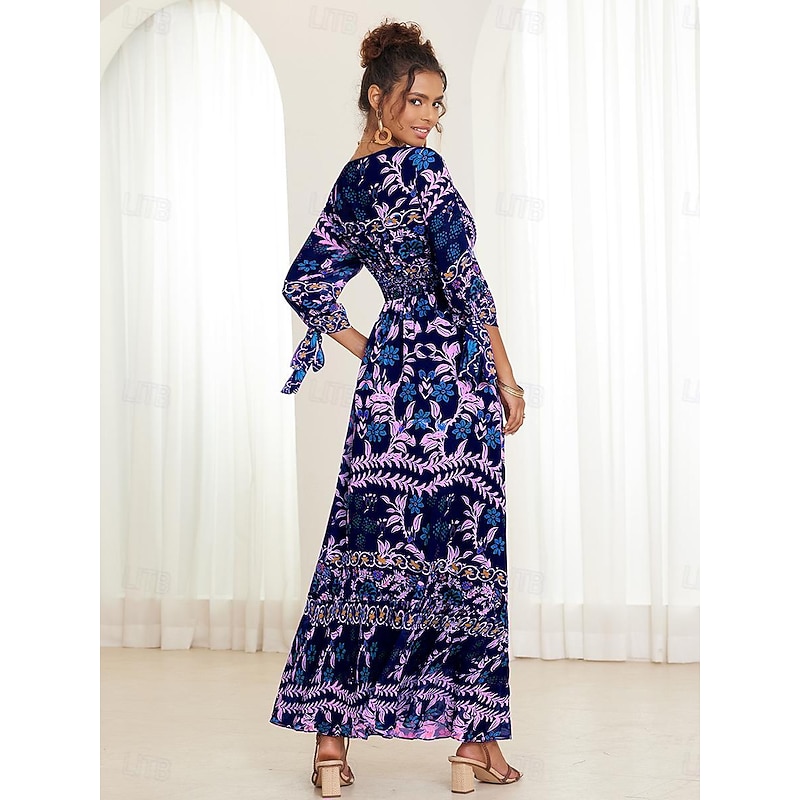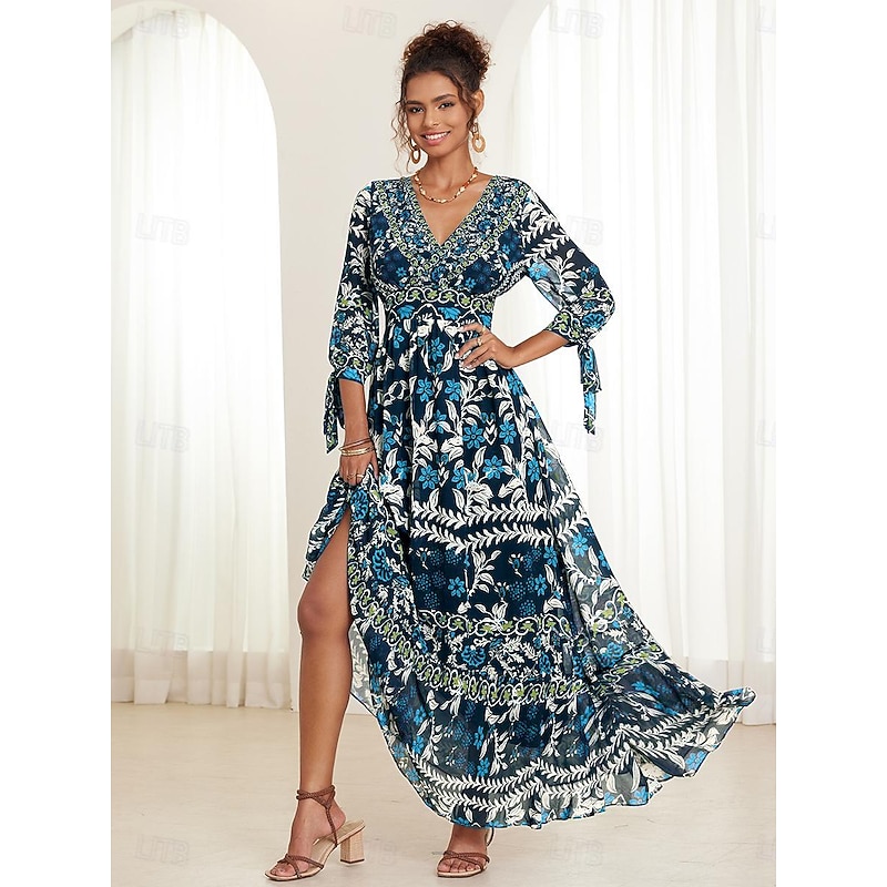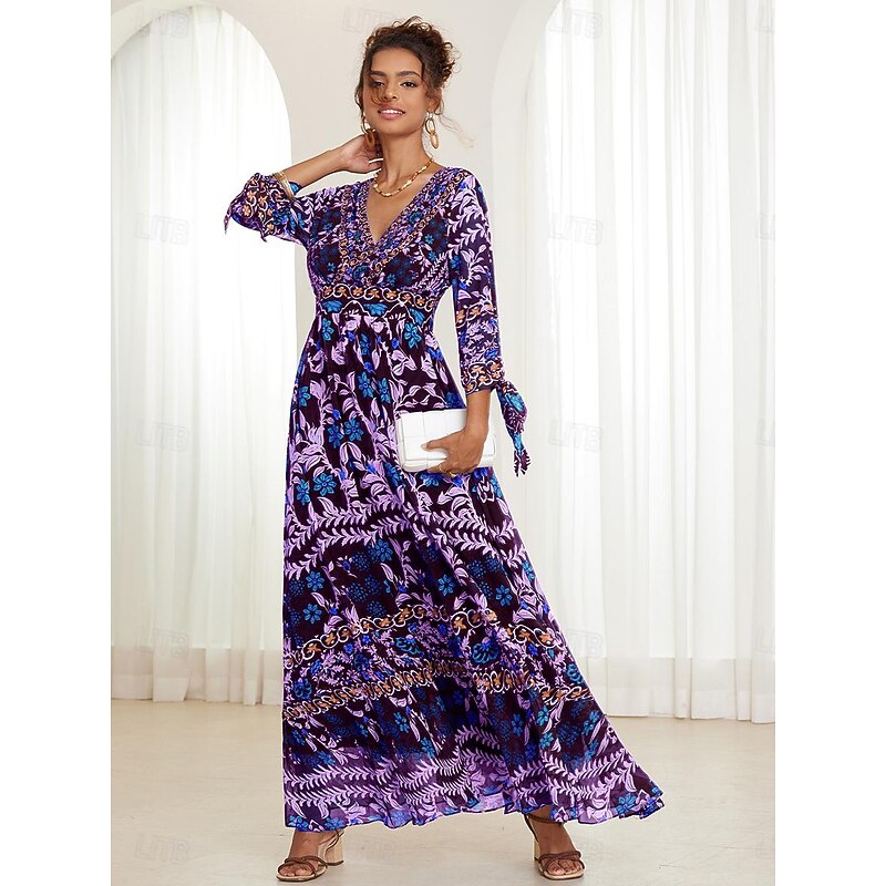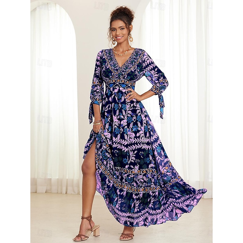 Highlights [Stunning Floral Boho Maxi Dress] : Crafted from lightweight polyester, this vibrant dress features a captivating floral pattern that perfectly embodies bohemian style. The deep V-neck design is complemented by puff sleeves with a delicate bow and ruffle details, adding a touch of romantic elegance. [Flowing Silhouette] : The dress boasts an A-line silhouette that gracefully enhances the natural shape, ensuring a comfortable and breezy fit. The high side slit adds a hint of allure and femininity, making it an ideal choice for summer outings. [Design Highlights] : Intricate embroidery accents the edges, while the three-quarter length bell-shaped sleeves with tie cuffs introduce a latest and chic vibe. This loose-fit, maxi-length dress is designed to flow elegantly with your every move. [Versatile Occasions] : Perfect for vacations, casual gatherings, or summer events, this dress effortlessly combines style and comfort. Its lightweight fabric and flowy design ensure you stay cool and fashionable on any occasion. [Available Sizes] : Offered in sizes S, M, L, XL, and XXL, in colors Blue, Purple, and Wine, providing a range of options to suit different preferences and body types. Perfect for everyday use. first-class materials and excellent craftsmanship ensure long-lasting durability.