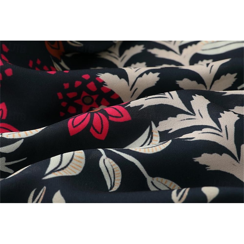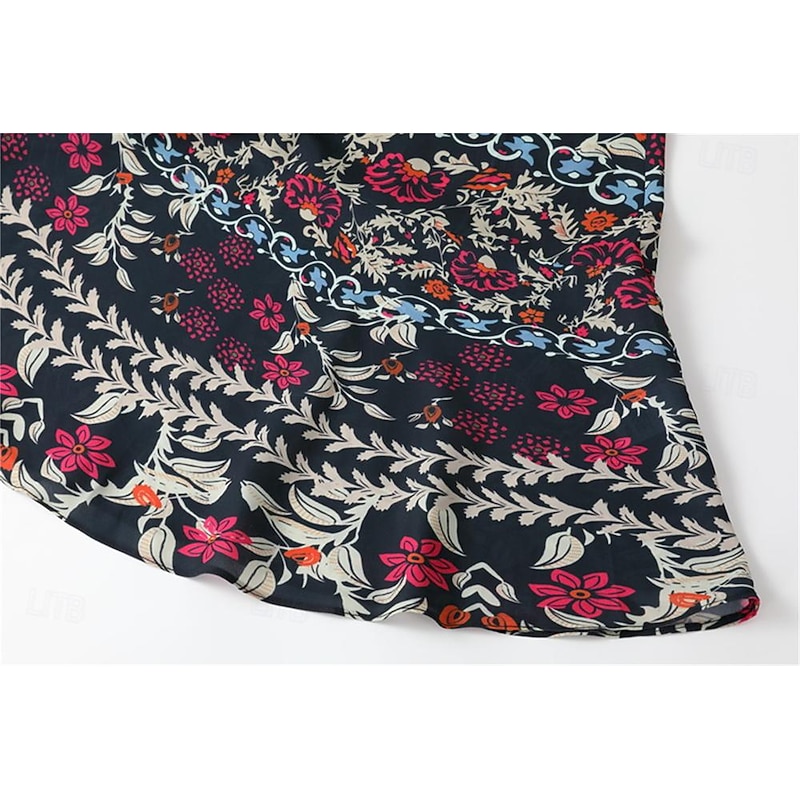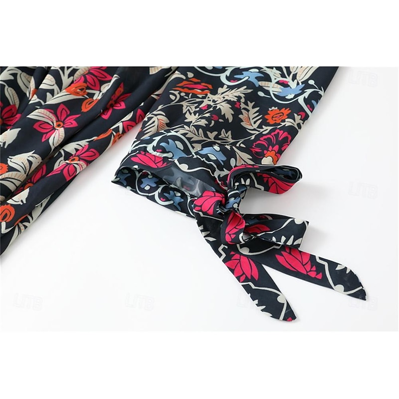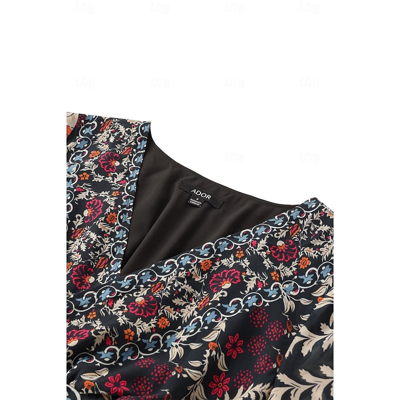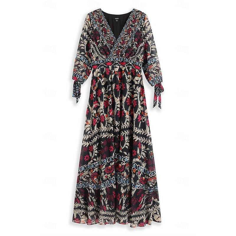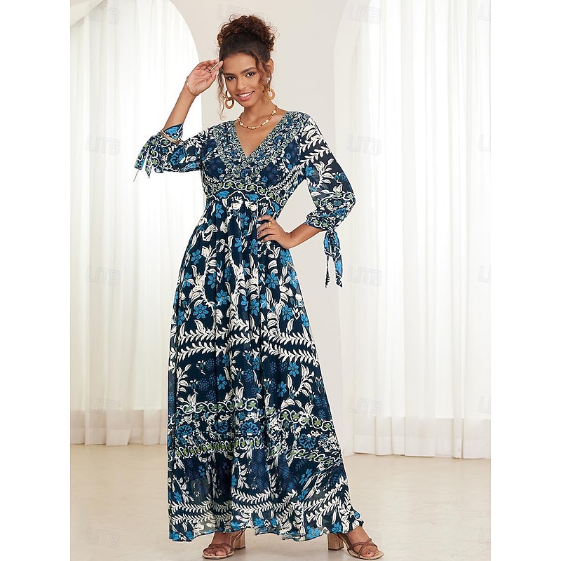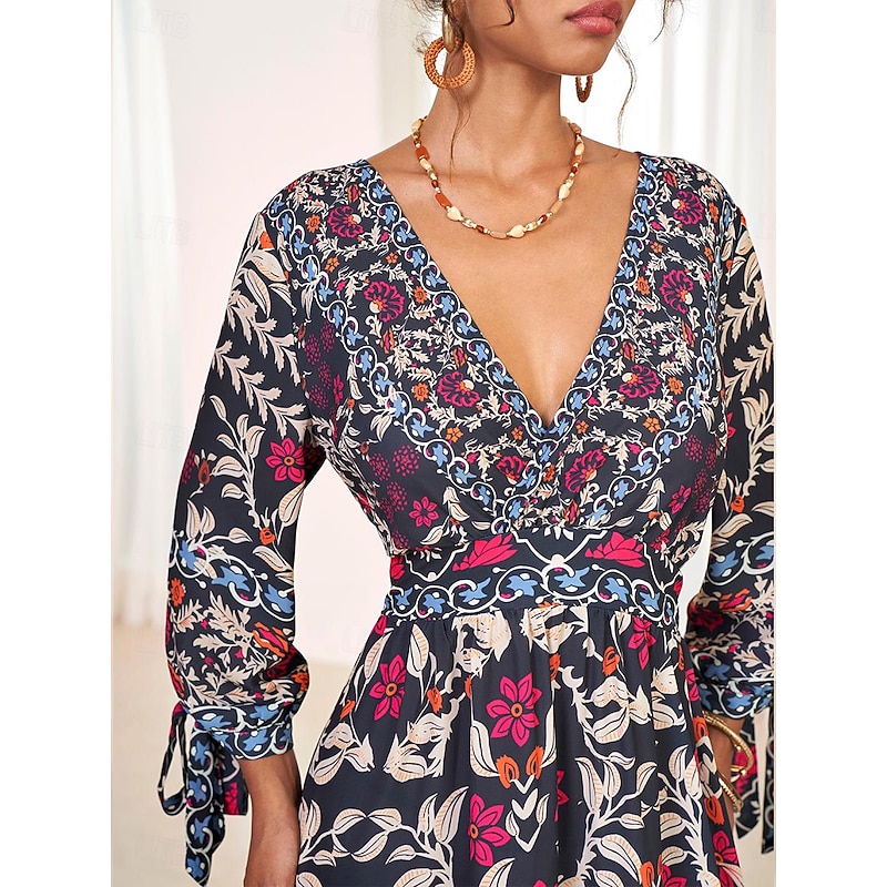 Highlights [Stunning Floral Boho Maxi Dress] : Crafted from lightweight polyester, this vibrant dress features a captivating floral pattern that perfectly embodies bohemian style. The deep V-neck design is complemented by puff sleeves with a delicate bow and ruffle details, adding a touch of romantic elegance. [Flowing Silhouette] : The dress boasts an A-line silhouette that gracefully enhances the natural shape, ensuring a comfortable and breezy fit. The high side slit adds a hint of allure and femininity, making it an ideal choice for summer outings. [Design Highlights] : Intricate embroidery accents the edges, while the three-quarter length bell-shaped sleeves with tie cuffs introduce a latest and chic vibe. This loose-fit, maxi-length dress is designed to flow elegantly with your every move. [Versatile Occasions] : Perfect for vacations, casual gatherings, or summer events, this dress effortlessly combines style and comfort. Its lightweight fabric and flowy design ensure you stay cool and fashionable on any occasion. [Available Sizes] : Offered in sizes S, M, L, XL, and XXL, in colors Blue, Purple, and Wine, providing a range of options to suit different preferences and body types. Perfect for everyday use. first-class materials and excellent craftsmanship ensure long-lasting durability.