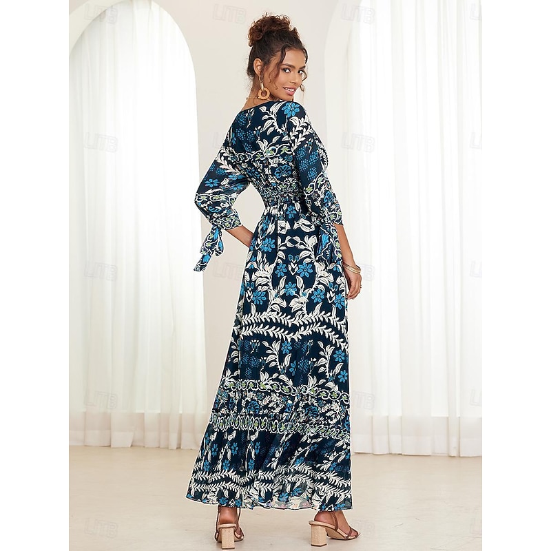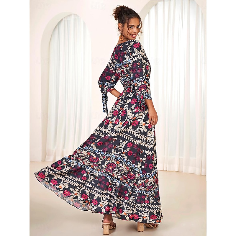 Women's Bohemian Maxi Dress V-Neck Long Sleeve Floral Belted Front Slit Navy Blue Pink Light Background Spring Summer Beach Party Casual Feminine Full Sizes