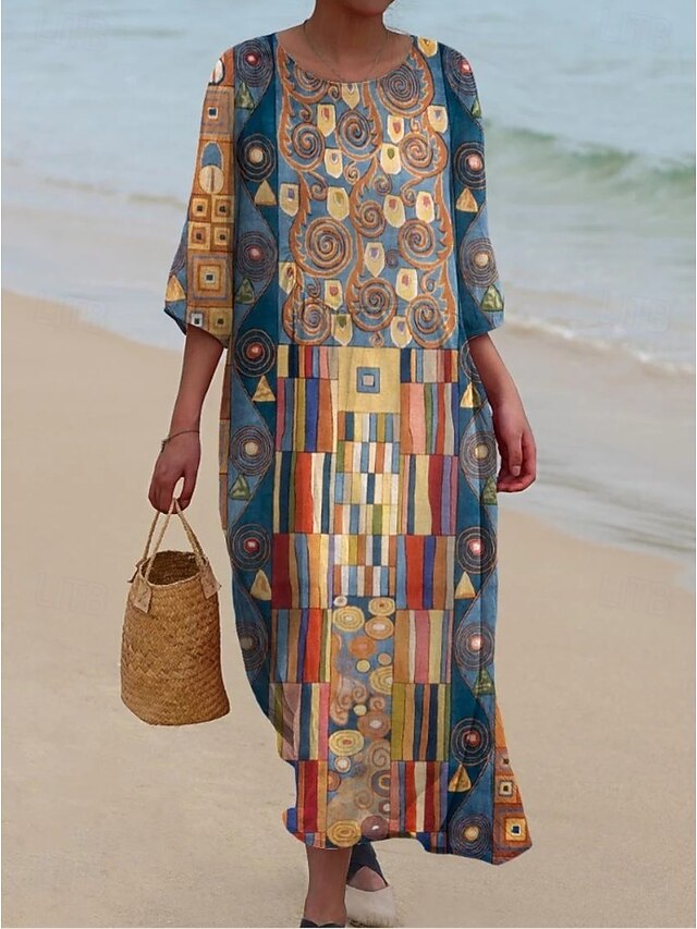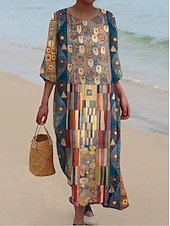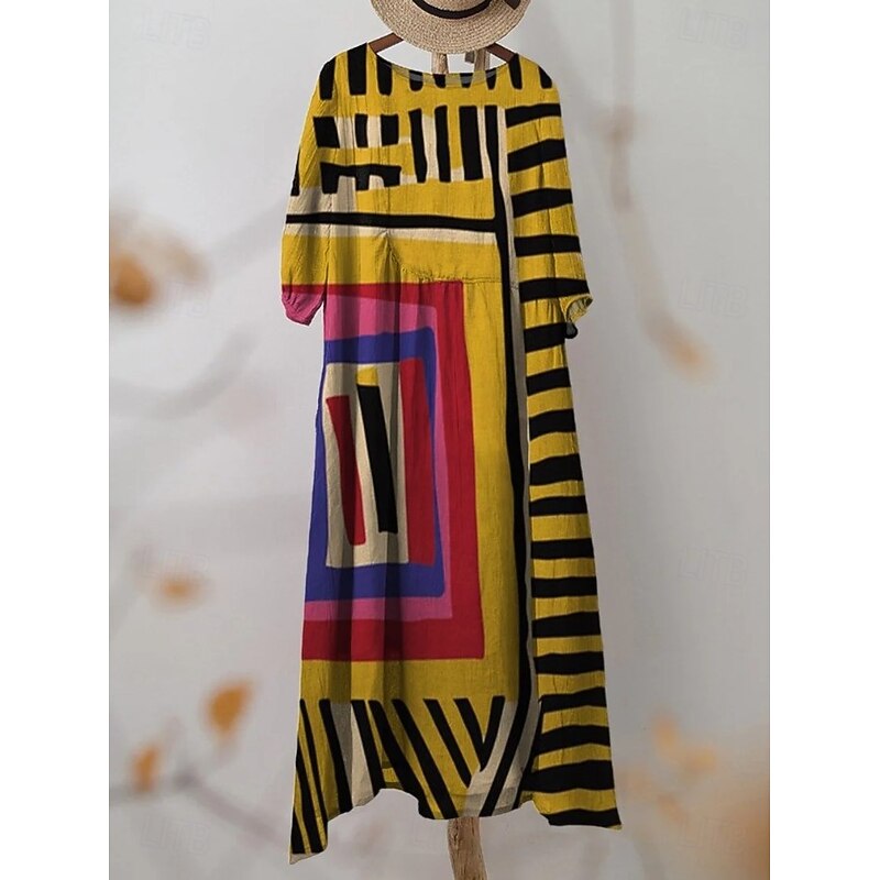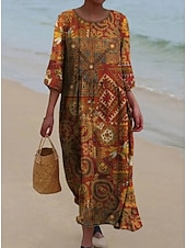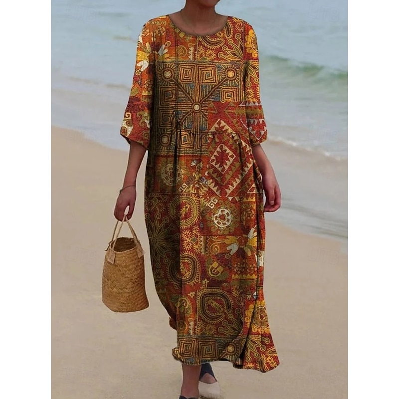 Why Choose Women's Maxi Dress Kaftan 3/4 Length Sleeve Crew Neck Casual A Line Dress Dress Boho Graphic Geometric Yellow Red Light Brown Brown?