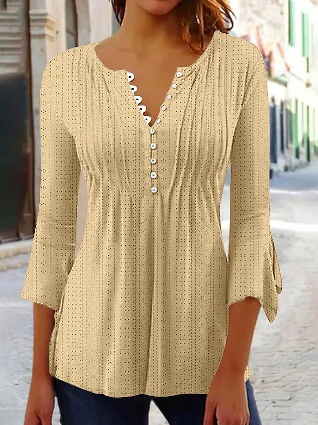 Highlights [Fabric] Crafted from lightweight polyester, this women's blouse offers a comfortable micro-elastic fit, perfect for spring and fall wear. The solid cream color with a subtle dotted pattern ensures a versatile, modern look for any wardrobe. [Fit] Designed with a modern, form-fitting silhouette, the blouse features a regular top length that pairs effortlessly with both jeans and tailored pants, offering flexibility for various occasions. [Design Highlights] This blouse showcases a flattering V-neckline accentuated by a decorative scalloped trim. The addition of small buttons along the front adds an elegant touch, while the three-quarter length sleeves with a slight flare provide a relaxed yet sophisticated appearance. [Occasions] Ideal for both daily wear and work environments, this blouse is suitable for casual outings and semi-formal occasions alike, bringing charm and style to any setting. [Size Range] Available in sizes S, M, L, XL, and 2XL, this blouse caters to a range of body types, ensuring a comfortable and stylish fit for everyone. Perfect for everyday use. superior materials and excellent craftsmanship ensure long-lasting durability.