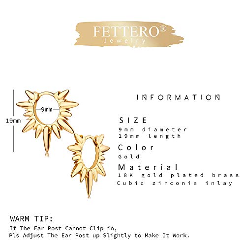 Material: MetalMetal type: Yellow-gold-plated-brassBack Finding: ClutchlessEarring design: HoopGem type: Cubic ZirconiaDelicate Package: You'll get 1 pair gold spike hoop earrings in a wonderful box, signatured FETTERO, ready to be given as a gift. Light weight women earrings, suitable for all-day wear, gold huggie hoop earrings, perfect for a wide range of outfits and stylesWomen Earrings Size: 12mm hoop with 5mm band width spike gold hoops, classic and delicate jewelry, huggie earrings for women and men, shiny and eye-catching. (Warm tip : If the ear post cannot clip in,pls adjust the ear post up or down slightly to make it work.)Material: 14K gold plated over brass, huggie hoops, Nickle-free, lead-free, and designed with low allergenicity, hypoallergenic summer beach jewelry. Simple gold plated hoop earrings go well with any outfit or style, especially suitable for women with sensitive skinAs a Present: This fashion everyday jewelry - gold spike earrings,a perfect gift for women.Especially for the trendy,gold plated hoops for all dress up and any occasion, e.g.Valentine's Day, Christmas, Mother's Day, Party, Engagement, Beach, Home, Office and Daily LifeUnique Brand: Fettero Jewelry - Express your style, be a GENTLEWOMEN. If you have any questions about the earring jewelry, please feel free to contact us. We will work with you to make sure you are completely satisfied Perfect for everyday use. superior materials and excellent craftsmanship ensure long-lasting durability.