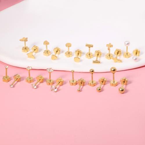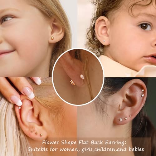 Material: Stainless SteelMetal type: Stainless SteelBack Finding: Screw BackEarring design: StudGem type: No Gemstone【Flower Shape Flat Back Earrings】One pack Includes 12 pairs flat back stud earrings can be worn interchangeably. These style are much more comfortable than the more traditional butterfly backing.These backings have a flower shape which helps you hold them without slipping while you put them on.And can sleep comfortably with them in.【20G Cartilage Earrings】These Small Earrings are made of Surgical Steel in 14K Gold Plated. Hypoallergenic, nickel-free and lead-free, especially friendly to sensitive ear. These are a great for woemn.Gauge: 20G (0.8mm) pin thickness, Post Length: 6mm.【Easy to Use】The screw on flat back is alot easier to use and super comfortable to wear..The flat back design is a game-changer, ensuring a secure and comfortable fit, especially for cartilage piercings and helix placements. Our small earrings can be dressed up or down for any occasion.These earrings can be used for first hole, second hole, third hole......【Daily Care】To extend the life of your premium costume jewelry, avoid exposure to cleaning agents, beauty products & water. Store it in a cool, dry place and wear it with love & intention.【sleek Gift Set】Multi-pack cartilage earrings for women, trendy, classic, dainty, lightweight, comfy, hypoallergenic. Wonderful gift for your family or friend on Christmas, Birthday, Mother's Day, Graduation, Valentine's Day, New Year, Party, Express your most sincere love to them Perfect for everyday use. High quality materials and excellent craftsmanship ensure long-lasting durability.