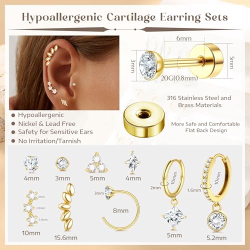 Material: Stainless Steel, BrassMetal type: Stainless SteelBack Finding: Flat BackEarring design: HoopGem type: No GemstoneItem type name: Hoop EarringsUltimate Comfort and Secure Fit: Experience unparalleled comfort and security with our flat back earrings. Designed for all-day and all-night wear, these cartilage earrings weigh just 2g-3g each, ensuring minimal strain on your ear. The flat back design holds the earring in place, preventing ear pins from poking or tangling in your hair. Perfect for showering, sleeping, exercising, or working, these helix earrings offer hassle-free wearPremium Materials: Our stainless steel flat back hoop earrings lavishly plated in white gold or 18K gold. Hypoallergenic, nickel free, and lead free, these cartilage hoop earrings set are designed for sensitive skin, ensuring a comfortable, irritation-free wearing experience with smooth edgesIdeal Size for Versatility: Our no-poke helix tragus piercing jewelry are perfectly sized, with gauge size of 20G -18G(0.8-1mm) and a bar length of 6mm. This makes them ideal for any occasion, whether you're dressing up for a formal event or keeping it casual.The multiple sizing cartilage piercing set to meet your diversified wearing needsStylish Variety with Our Economy Earrings Set: A set contains snake cartilage stud earrings, leaf tragus earrings,double huggie earring, small gold hoop earrings and multi-hole studs earring and so on. This set isn't just for you, share the fashion-forward styles with friends or family and enjoy the exceptional value of this hypoallergenic earrings setZELORES Multiple Piercing Jewelry Service: If you have any questions about small hoop earrings and flatback earrings jewelry, our team is ready to assist. We aim to provide a flawless shopping experience and resolve any issues promptly Perfect for everyday use. premium materials and excellent craftsmanship ensure long-lasting durability.