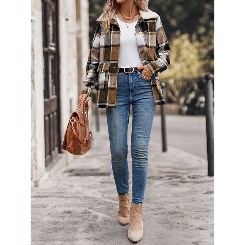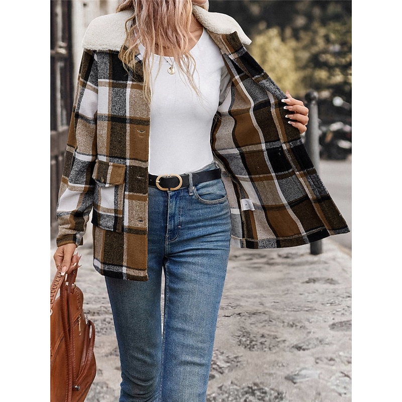 Highlights [Fabric] : Expertly crafted from a high-quality polyester blend, this women’s winter coat offers both warmth and breathability. The fabric is designed to provide insulation during chilly months, while maintaining a pleasant, micro-elastic fit. [Fit] : The coat boasts a regular fit that is both fashionable and practical, allowing for easy layering over sweaters or t-shirts. Its design ensures a relaxed silhouette suitable for everyday and outdoor wear. [Design Highlights] : This coat features a sophisticated turndown fur collar that adds a touch of elegance and additional warmth. Its single-breasted placket with a button-down front closure offers easy wearability. The plaid pattern, combined with stripes in khaki hues, contributes to its versatile style, while functional pockets add practicality to the look. [Occasions] : Perfect for daily wear, street style outings, or outdoor activities during fall and winter. Whether you're on a casual hike or spending a day in the city, this jacket is designed to keep you comfortable and fashionable across various settings. [Size Range] : Available in a range of sizes from S to XL, this coat ensures a perfect fit for various body types, making it a versatile addition to your winter wardrobe.