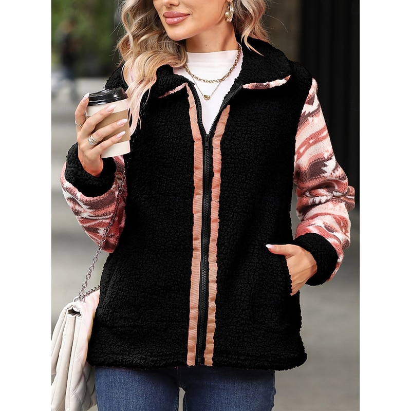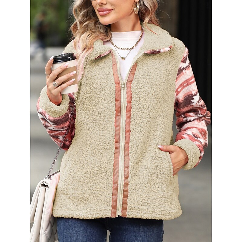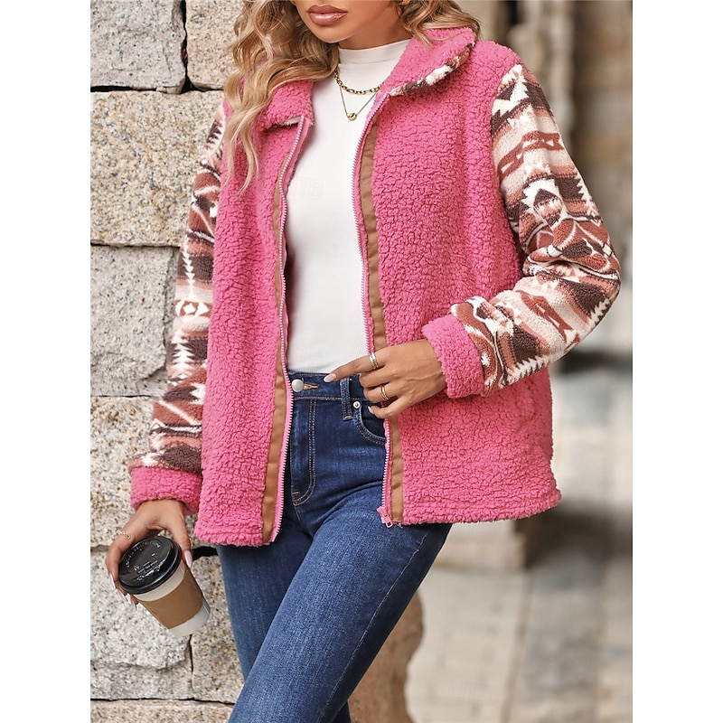 sizzling ! Women's Fleece Jacket Teddy Coat Hoodie Jacket snug Breathable Zipper Pocket Fleece Lined Vintage Casual Geometric Vacation Street Daily Wear Going out Zipper Regular Turndown Regular Fit Long Sleeve