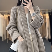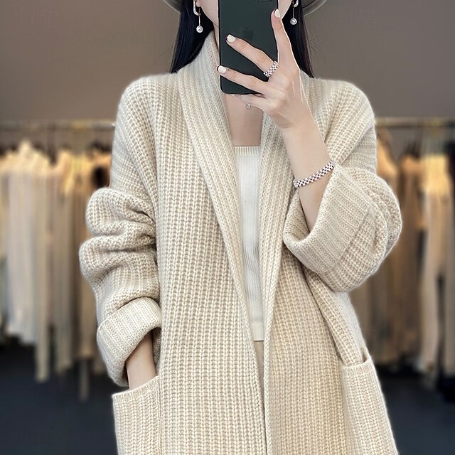 More information about Women's Sweater Cardigan Streetwear Casual Solid Color Shirt Collar Pocket Knitted Long Sleeve Long Tops Knit Holiday Going out Weekend Camel Beige Fall Winter