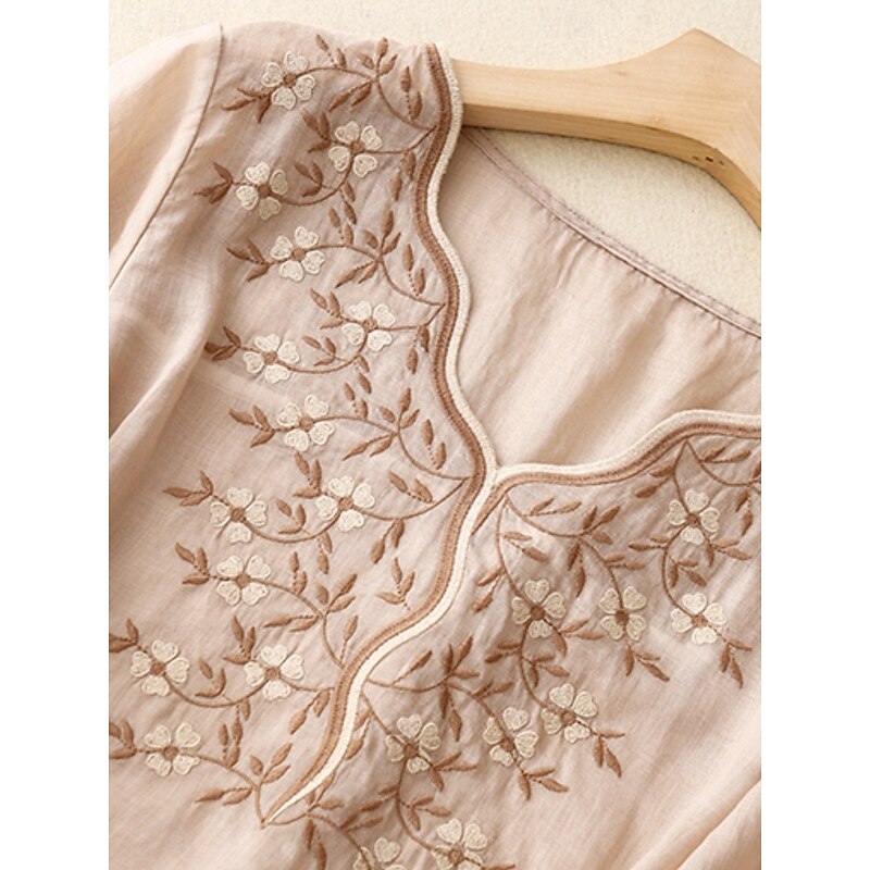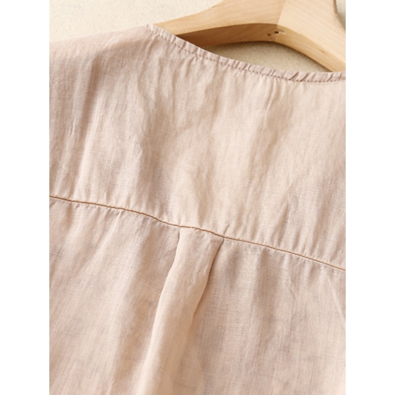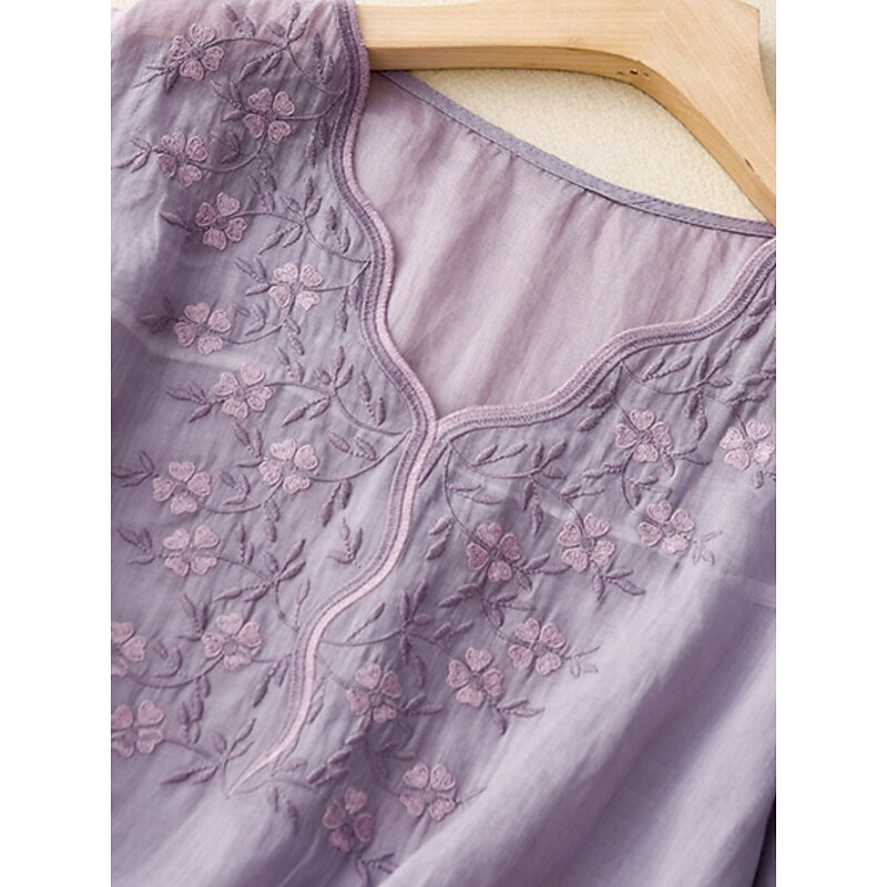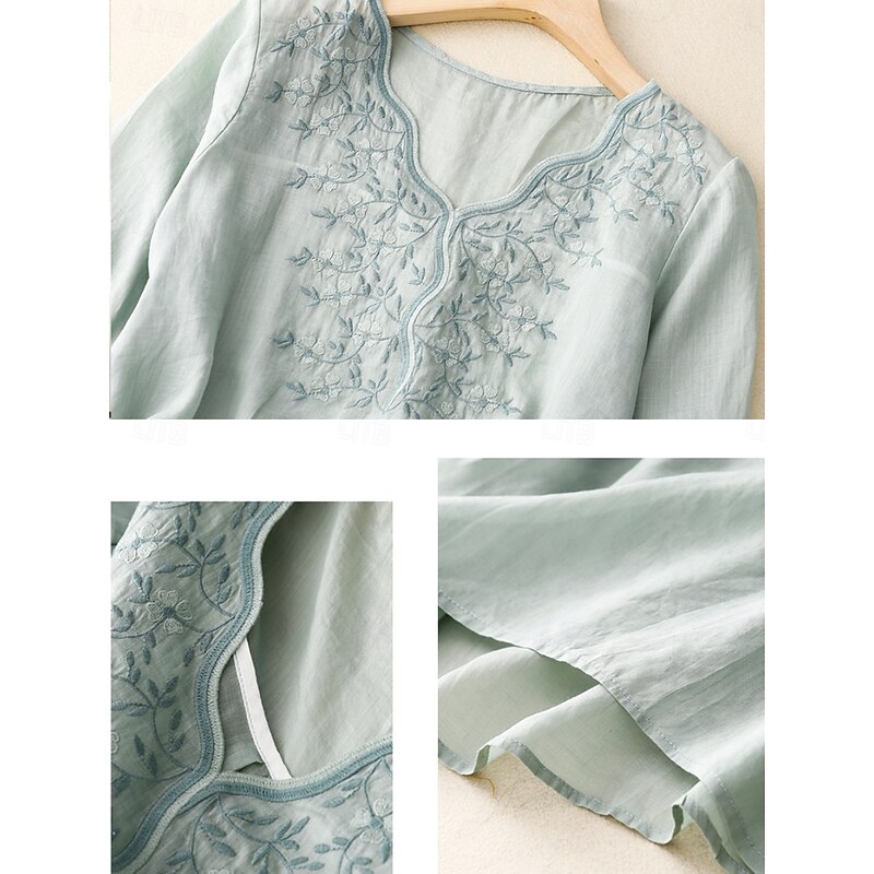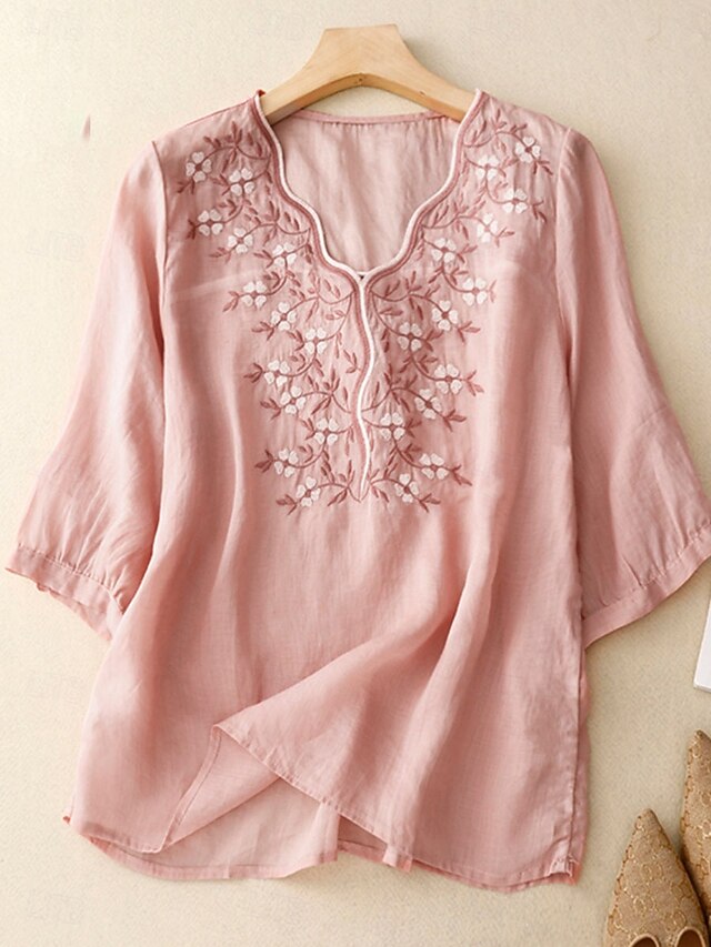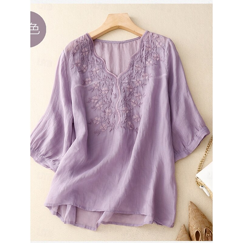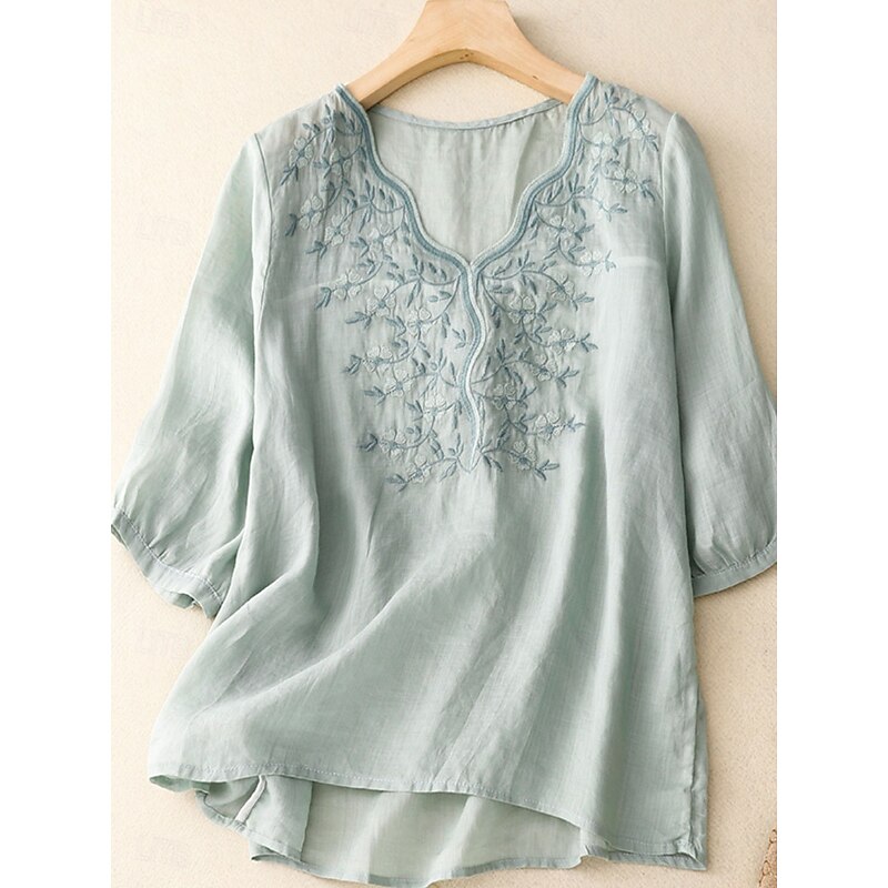 More information about Women's Cotton Linen Shirts Solid Color fashionable Basic Casual 3/4 Length Sleeve V Neck Regular Tops Daily Embroidered Light Green Pink Purple Khaki Summer