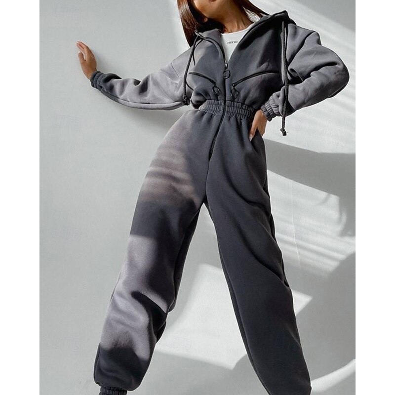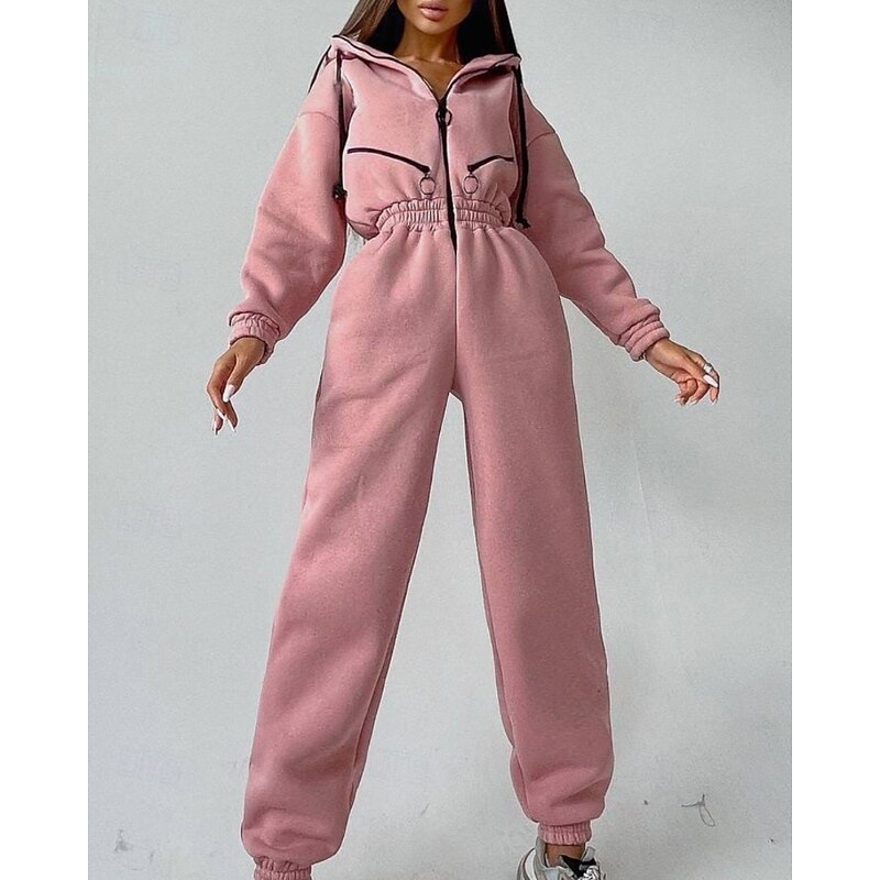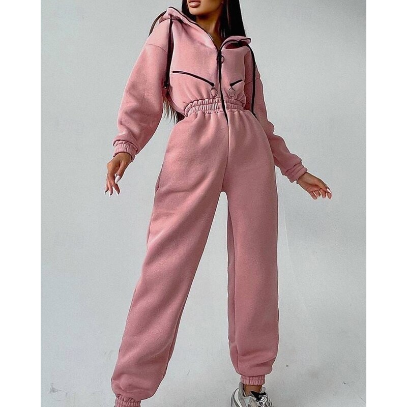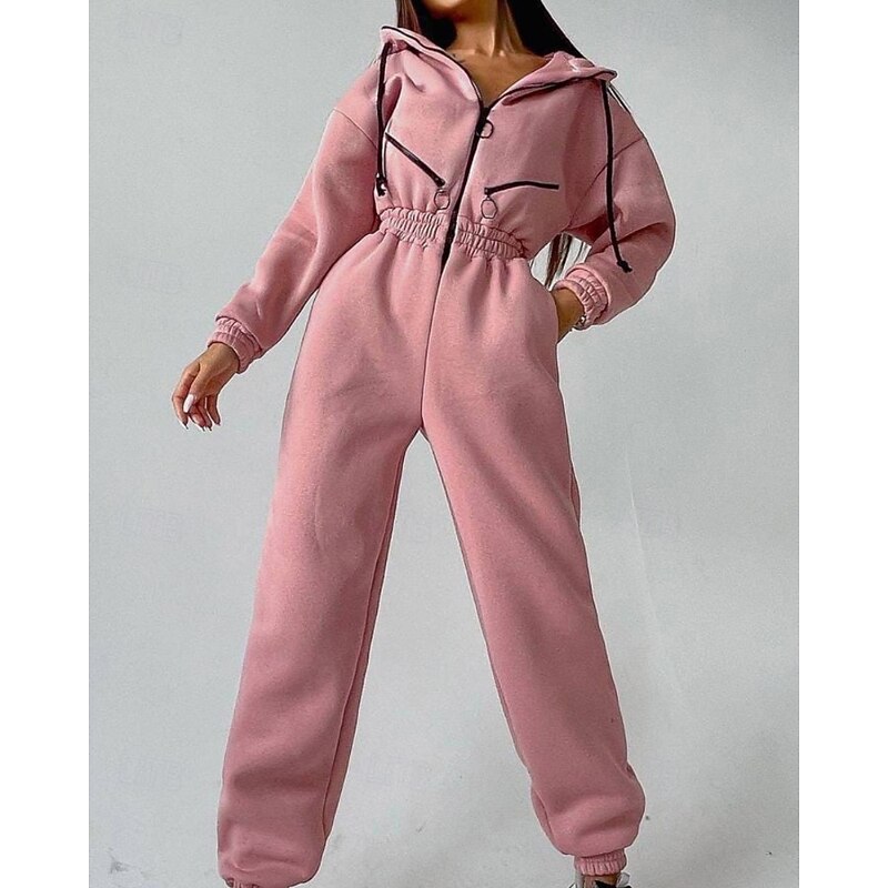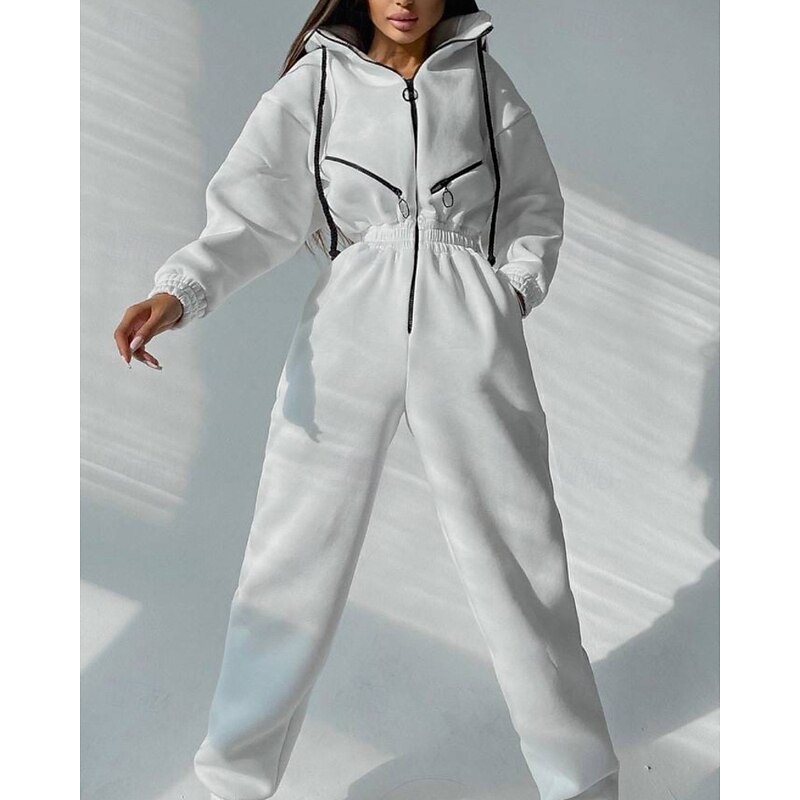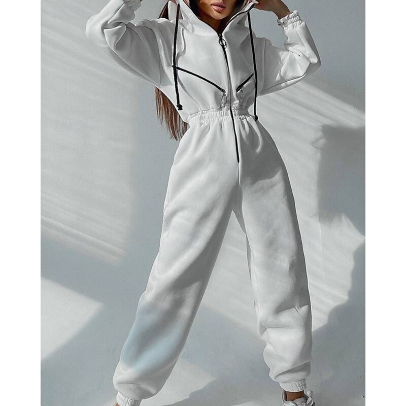 Women's Normal Jumpsuit Streetwear Color Block Long Sleeve Hooded Patchwork Zipper Street Daily Regular Fit White Pink Blue Fall 13