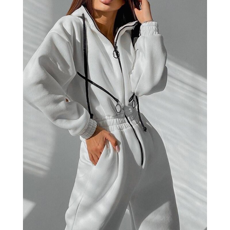 Women's Normal Jumpsuit Streetwear Color Block Long Sleeve Hooded Patchwork Zipper Street Daily Regular Fit White Pink Blue Fall 4