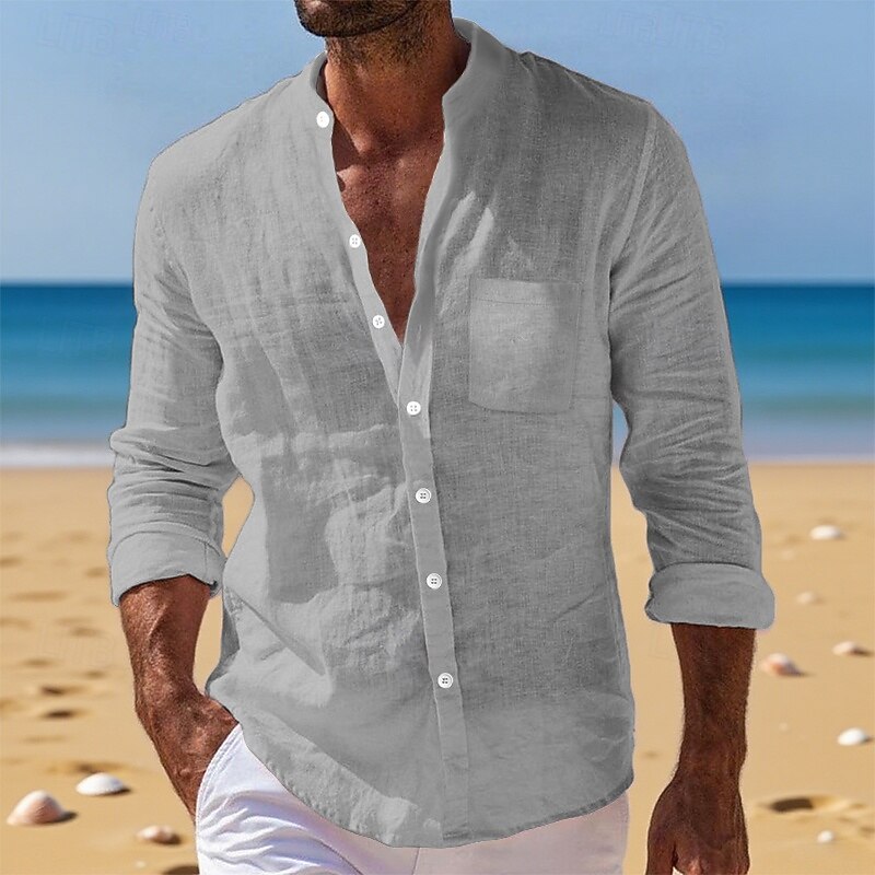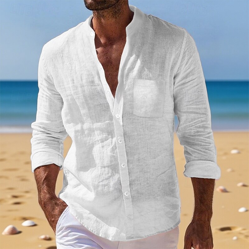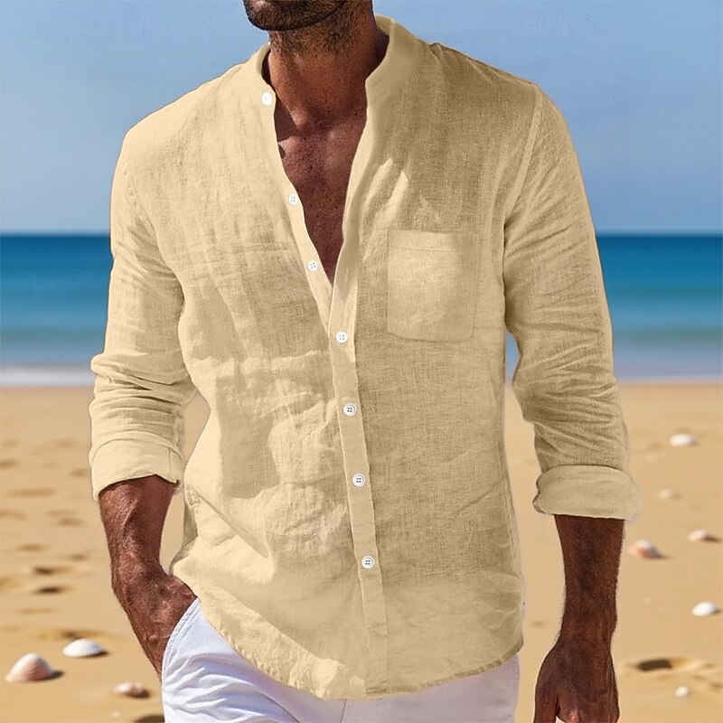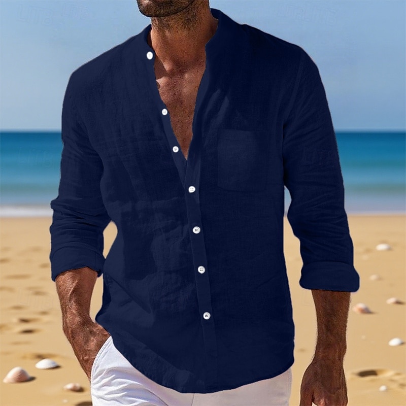 Men's Shirt Linen Shirt Summer Shirt Beach Wear Button Up Shirt Plain Vacation Daily White Yellow Navy Blue Blue Long Sleeve Band Collar Summer Fall Clothing Apparel Front Pocket 12