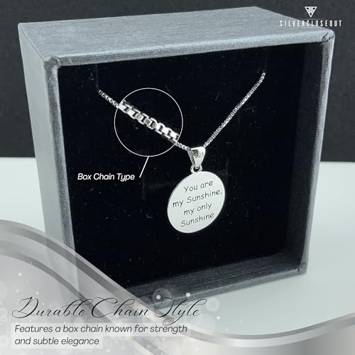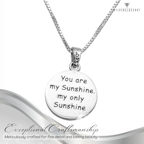 Item width: 15 millimetersMaterial: Sterling SilverMetal type: Sterling SilverClasp type: LobsterChain type: BoxMetal weight: 5 gMade from Rhodium Plated 925 Sterling Silver. Comes with an 18 Rhodium Plated Sterling Silver Italian Box ChainYou Are My Sunshine Round Pendant Dimensions: Diameter 15mm / 0.59inPerfect Gift for Any Occasion: A exquisite keepsake for the one you love. Our Sterling Silver Jewelry comes in a gift box ready to gift to that special someone. A one-of-a-kind gift to your loved ones, girlfriend, wife, fiancee, mother, mother in law, daughter, granddaughter, sister, your friend, or even yourself! Gifts for the holiday season or valentine's day, mother's day, Christmas day, and so on. Express your love with this beautiful necklace and make them feel very special.Sterling Silver Hypoallergenic Jewelry Recommended Care and Cleaning Instructions: To keep your silver jewelry looking new we recommend using a soft cotton cloth to gently wipe your .925 Sterling Silver Jewelry of deposited make-up and skin oils after each wearing. You can use silver cleaner or warm water with some baking soda to clean tarnished silver jewelry. To keep from tarnishing Avoid the use of chlorine bleach, and do not wear your silver jewelry when you go into a swimming pool. Perfect for everyday use. premium materials and excellent craftsmanship ensure long-lasting durability.