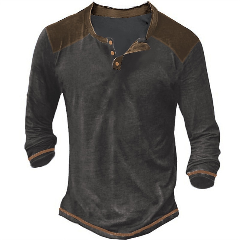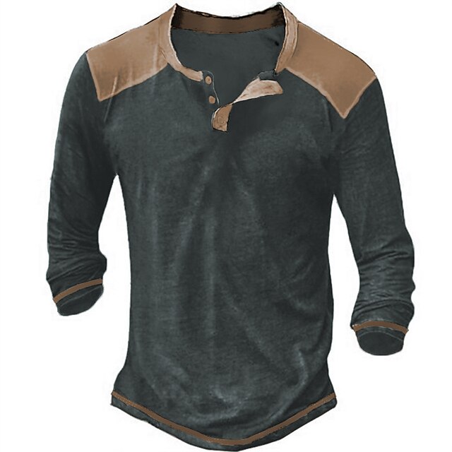 Highlights [Fabric] Crafted from a soft blend of cotton and polyester, this men's Henley shirt offers a breathable and durable fabric that's perfect for transitioning between seasons. The micro-elasticity of the material ensures a comfortable fit that moves with you. [Fit] Designed as a regular fit, this shirt is tailored to provide a balance between a relaxed and fitted style. It’s ideal for men who appreciate comfort without compromising on style. [Design Highlights] Featuring a timeless Henley neckline with a three-button placket, this shirt combines traditional elements with new-age flair. The striking color block pattern contrasts deep charcoal gray with beige accents on the shoulders and button placket, adding visual interest to the overall look. Ribbed cuffs and a slightly rounded hem complete the design, ensuring a snug fit and a relaxed silhouette. [Occasions] Perfect for a variety of settings, this versatile Henley shirt suits both casual outings and dressier occasions. Whether you're headed to a weekend gathering, engaging in sports activities, or simply going for a streetwear look, this shirt complements your style effortlessly. Its classic design makes it ideal for spring and fall, easily pairing with jeans or chinos. [Sizes] Available in a range of sizes from S to 3XL, this shirt caters to a wide audience, ensuring you can find the perfect fit for your body type.