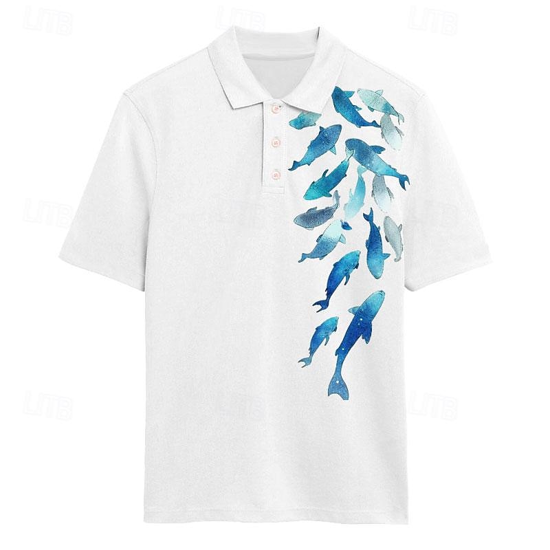 Highlights [Fabric] Constructed from a breathable pique fabric, this men's polo shirt delivers ultimate comfort and a micro-elastic fit, ensuring ease of movement whether on the golf course or a tropical vacation. [Fit] Offering a timeless yet casual aesthetic, the shirt features a collared neckline and short sleeves, ideal for maintaining a relaxed fit and style during cozy summer days. [Design Highlights] The shirt boasts a charming aquatic motif with vibrant 3D-printed blue fish, set against a light blue background to evoke a refreshing ocean vibe. The addition of buttons and a classic collared design lends a sophisticated touch. [Occasions] Perfect for a variety of leisurely settings such as beach wear, vacation outings, and tropical parties. Its versatile style blends seamlessly into both casual gatherings and more relaxed social events. [Size] Available in a range of sizes from S to 3XL, this polo shirt is designed to accommodate a wide array of body types, ensuring a flattering fit for men of all shapes and sizes.
