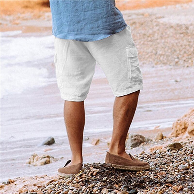sizzling ! Men's Shorts Linen Shorts Summer Shorts Beach Shorts Drawstring Multi Pocket Plain Comfort supple Knee Length Casual Daily Streetwear traditional Style White Army Green