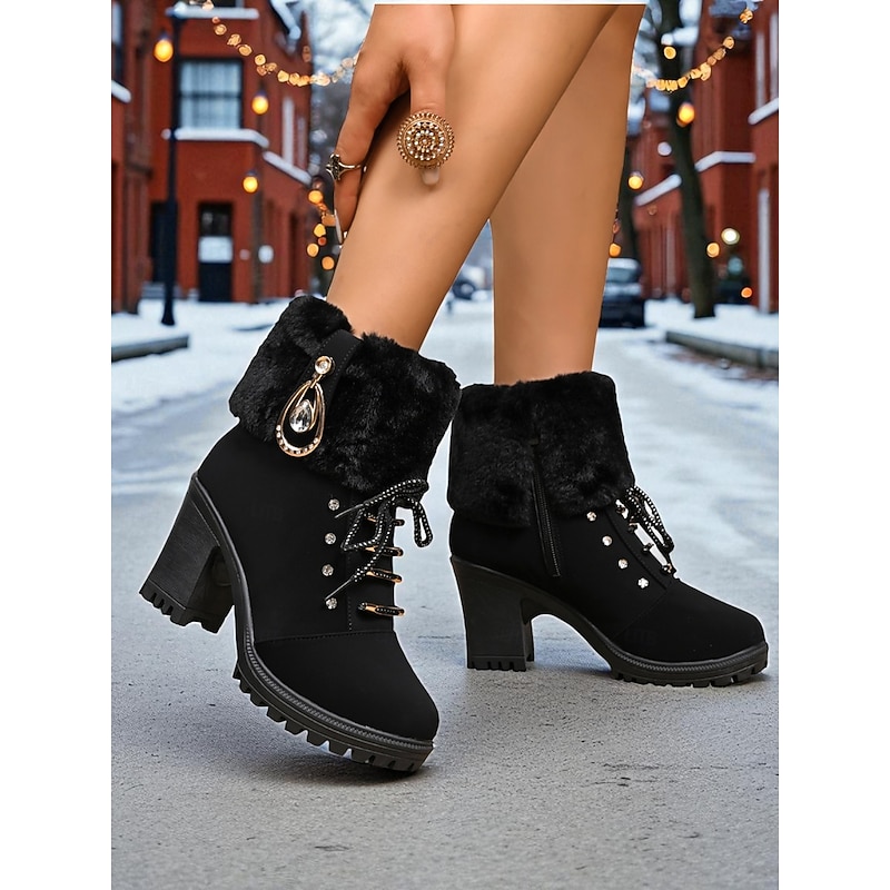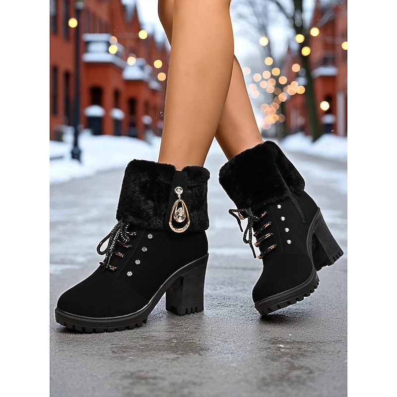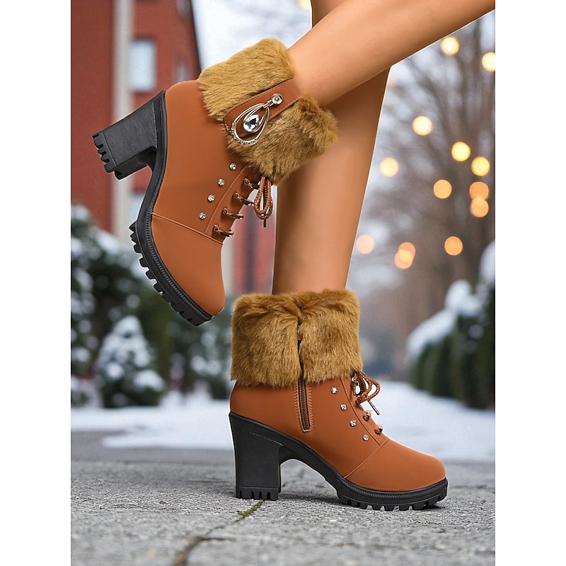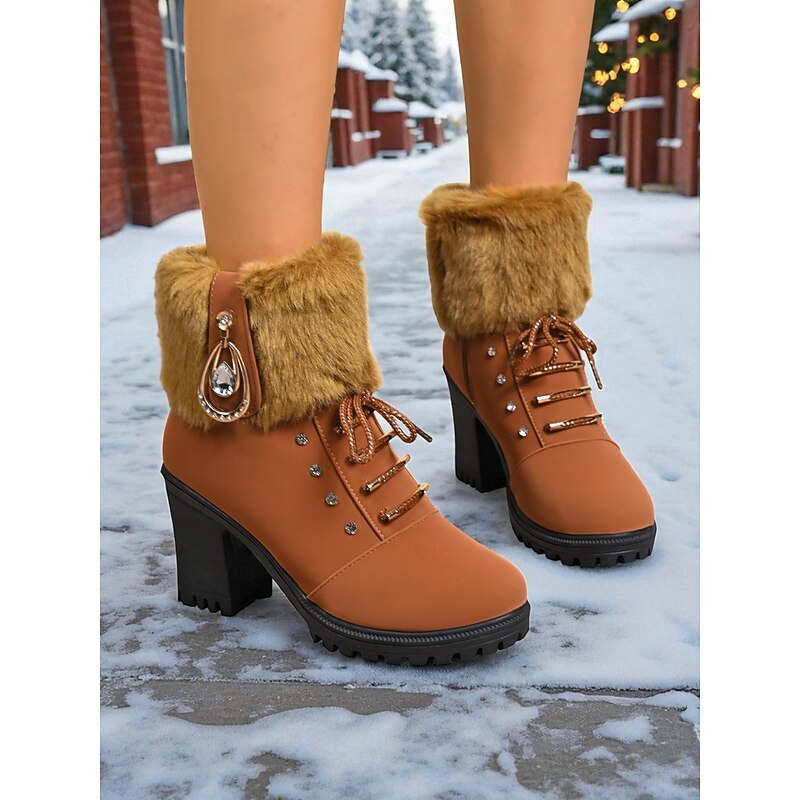 Women's Brown Faux Leather Ankle Boots with Fur Cuff and Chunky Block Heel – Warm Winter Lace-Up Booties with Rhinestone Detail for Ladies, Perfect for Outdoor, Casual & Holiday Wear 12
