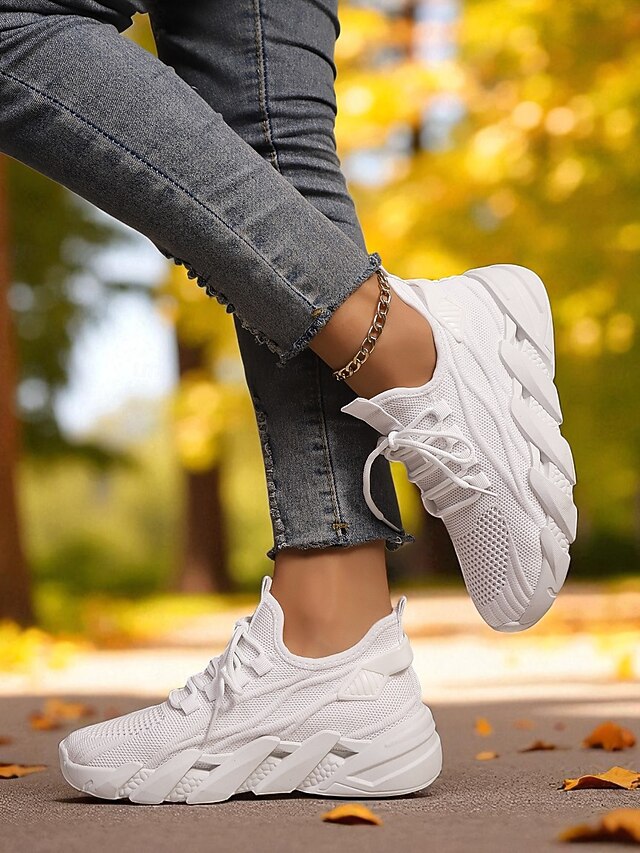 Women's White Chunky Sole Lace-Up Sneakers – Lightweight Breathable Mesh Sports Shoes for Running, Walking & Casual Outfits 19