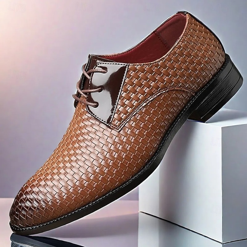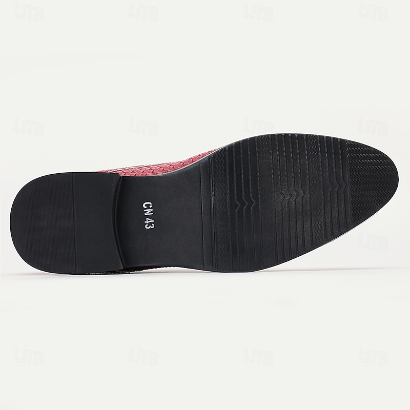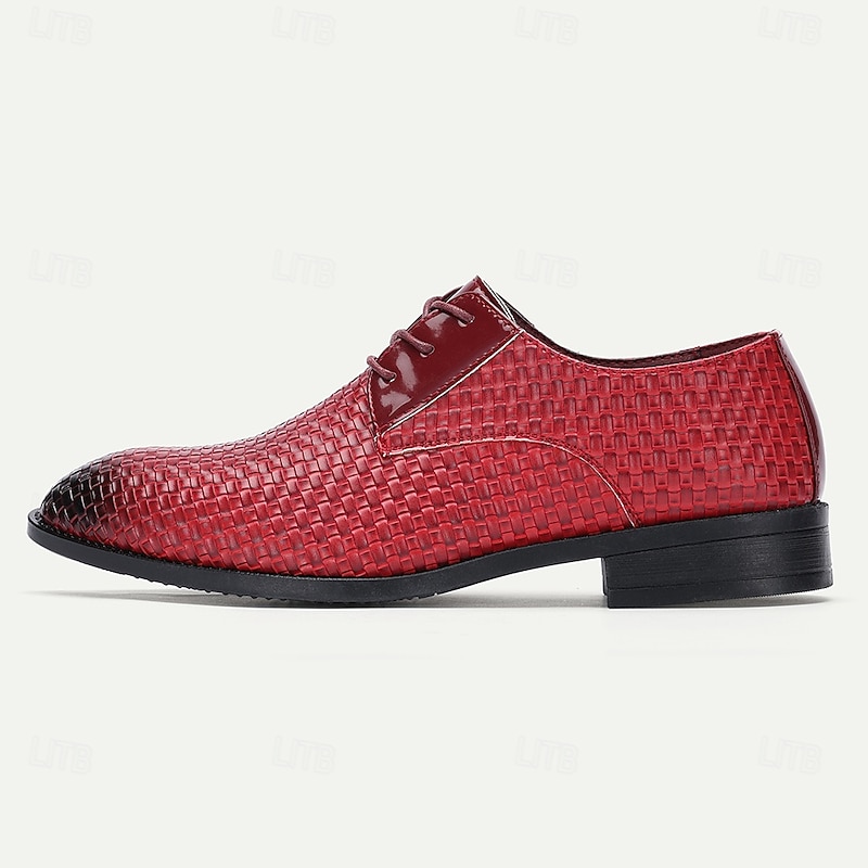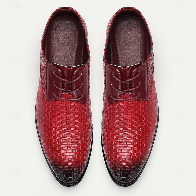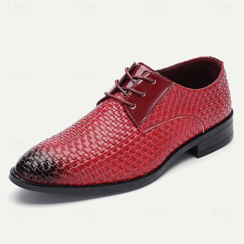 Highlights [Men's Red Woven Faux Leather Dress Shoes Highlights] [Fabric & Material]: Crafted with high-quality PU leather upper, these oxford shoes showcase a striking red woven design that's both eye-catching and breathable. The glossy finish adds a sophisticated touch, ideal for various occasions. [Fit & Style]: These oxfords feature a classic lace-up closure, providing a secure and adjustable fit. The sleek, round toe and polished texture make them suitable for both formal events and smart-casual settings. [Design Highlights]: The standout feature of these shoes is their special basket-weave pattern, which adds texture and visual appeal. The black rubber outsole offers a sleek contrast and ensures durability and slip resistance, making them comfortable for extended wear. [Occasions]: Perfect for Christmas parties, formal gatherings, or any occasion where making a bold style statement is desired. These shoes blend classic elegance with a modern twist, suitable for those who cherish refined style. [Size Range]: Available in a wide range of sizes from US7 / EU39 / UK6 to US12 / EU45 / UK11, ensuring a perfect fit for every gentleman. Perfect for everyday use. top-grade materials and excellent craftsmanship ensure long-lasting durability.