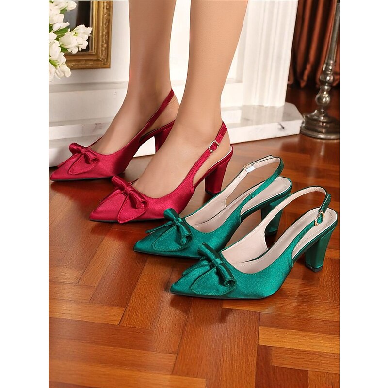 More information about Women's 1950s Vintage Green Satin Slingback Heels with Bow – Elegant Pointed Toe Mid Heel Shoes for Weddings, Parties, and Formal Occasions