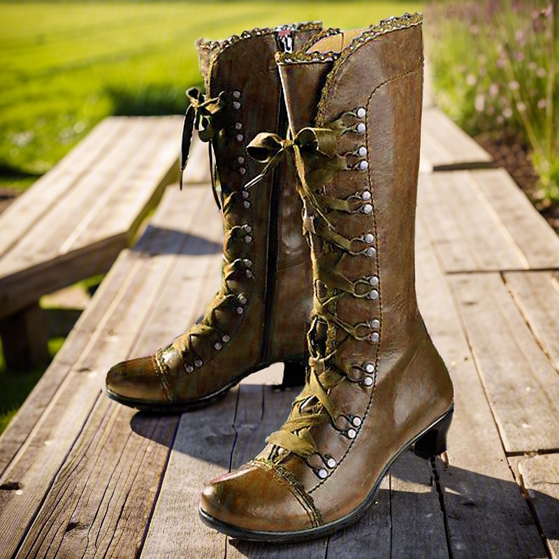 Women's Vintage Gatsby Victorian Lace-Up Mid-Heel Black Faux Leather Boots - Steampunk Gothic Style for Daily Wear, Cosplay, and 1920s Gatsby Parties 1