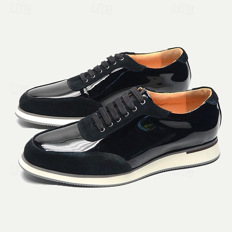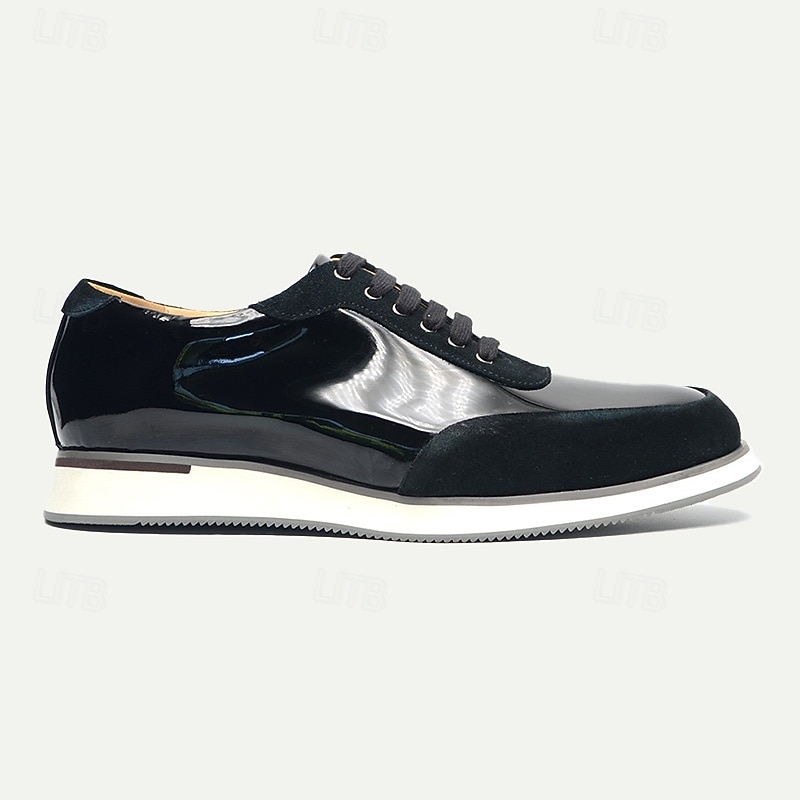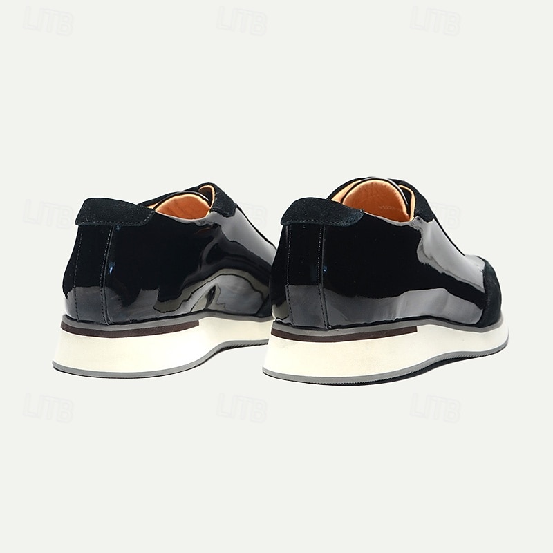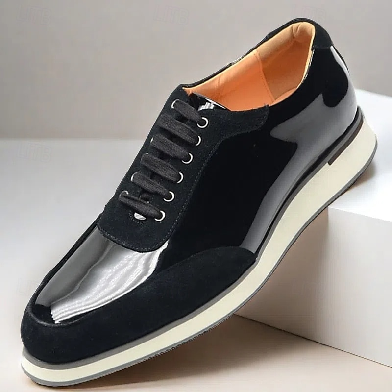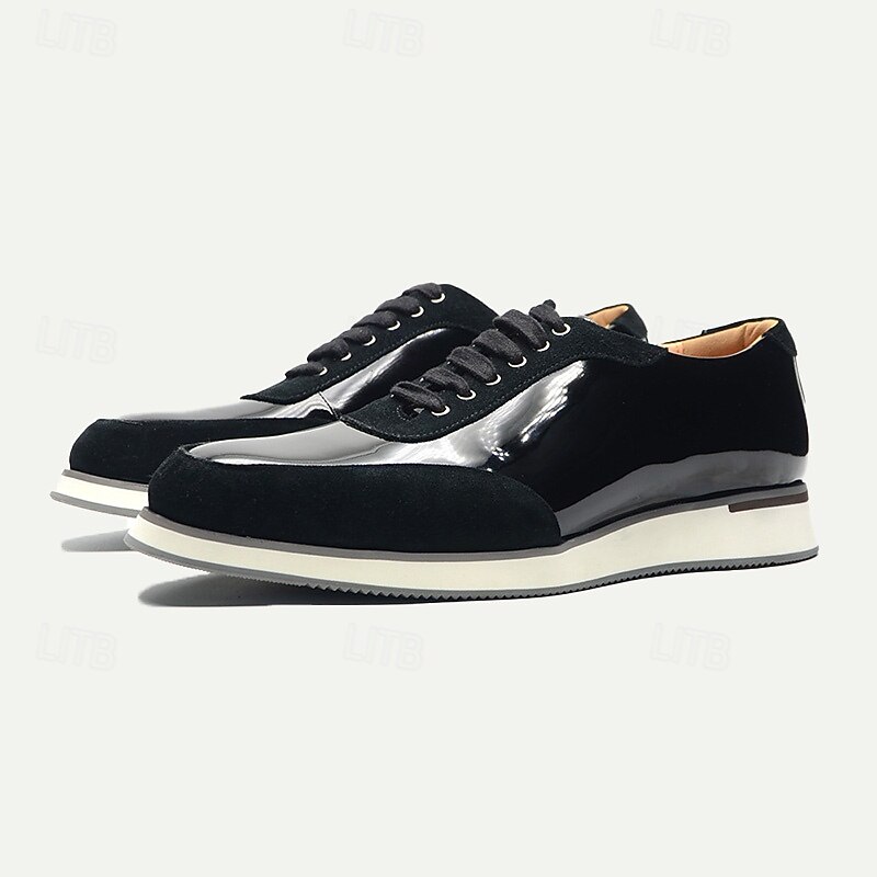 Men's Black Lace-Up Shoes in Patent Leather and Suede with White Sole – Premium Cowhide Dress Shoes for contemporary Casual and Formal Wear